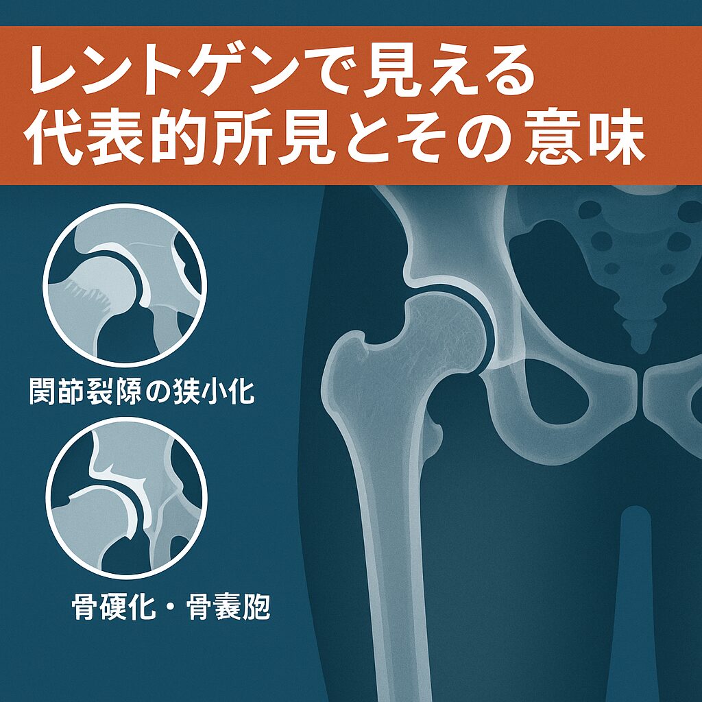 変形性股関節症は、加齢や負荷の蓄積などによって関節の軟骨がすり減り、骨の形が変化していく疾患と言われています。レントゲンでは、関節のすき間(関節裂隙)や骨棘、骨硬化、骨嚢胞など、進行度を推測できる“サイン”が現れます。