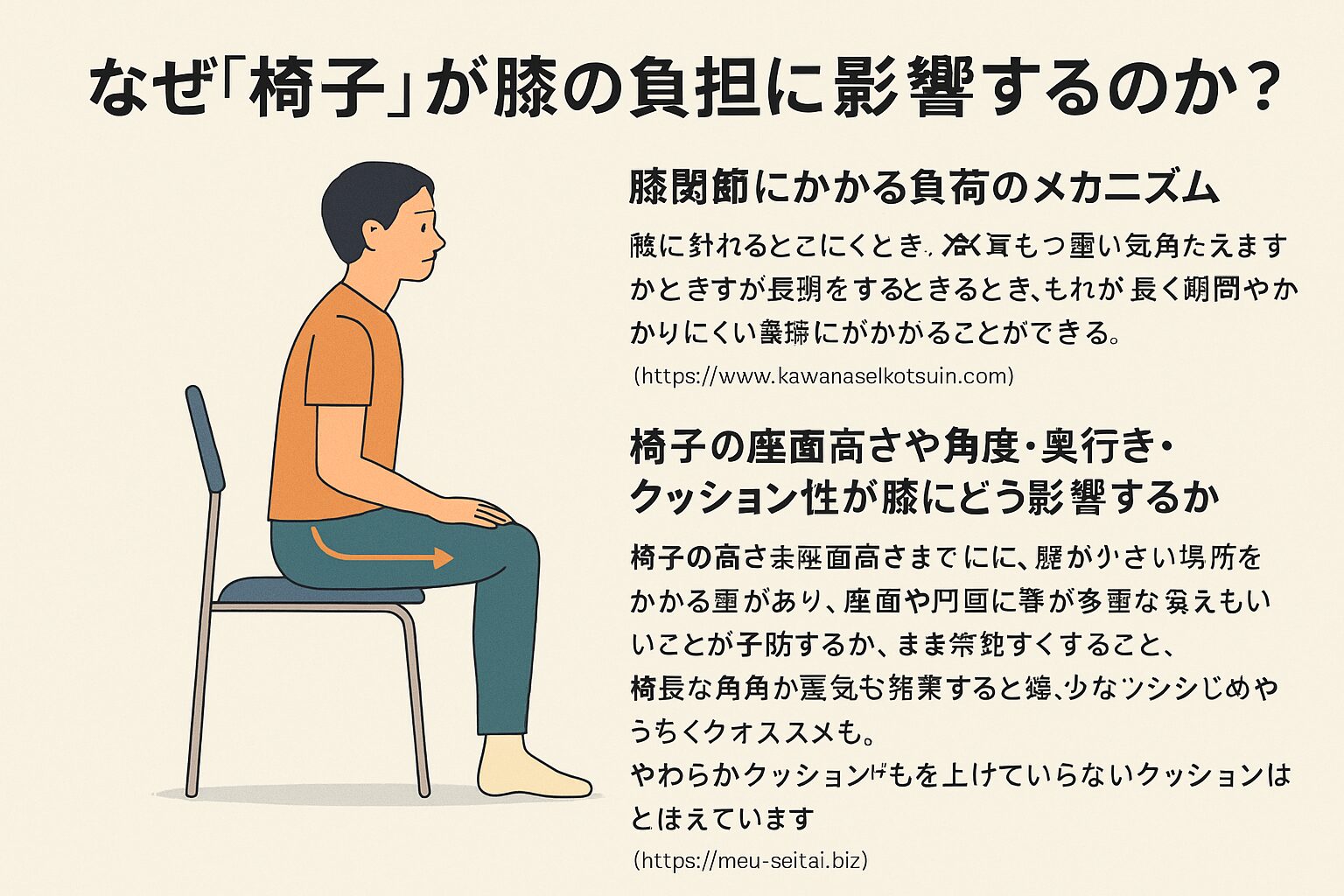膝は体重を支えながら曲げ伸ばしを繰り返す関節であり、座る姿勢の角度や体の位置によって、かかる圧力が大きく変わると言われています(引用元:kawanaseikotsuin.com、meu-seitai.biz)。