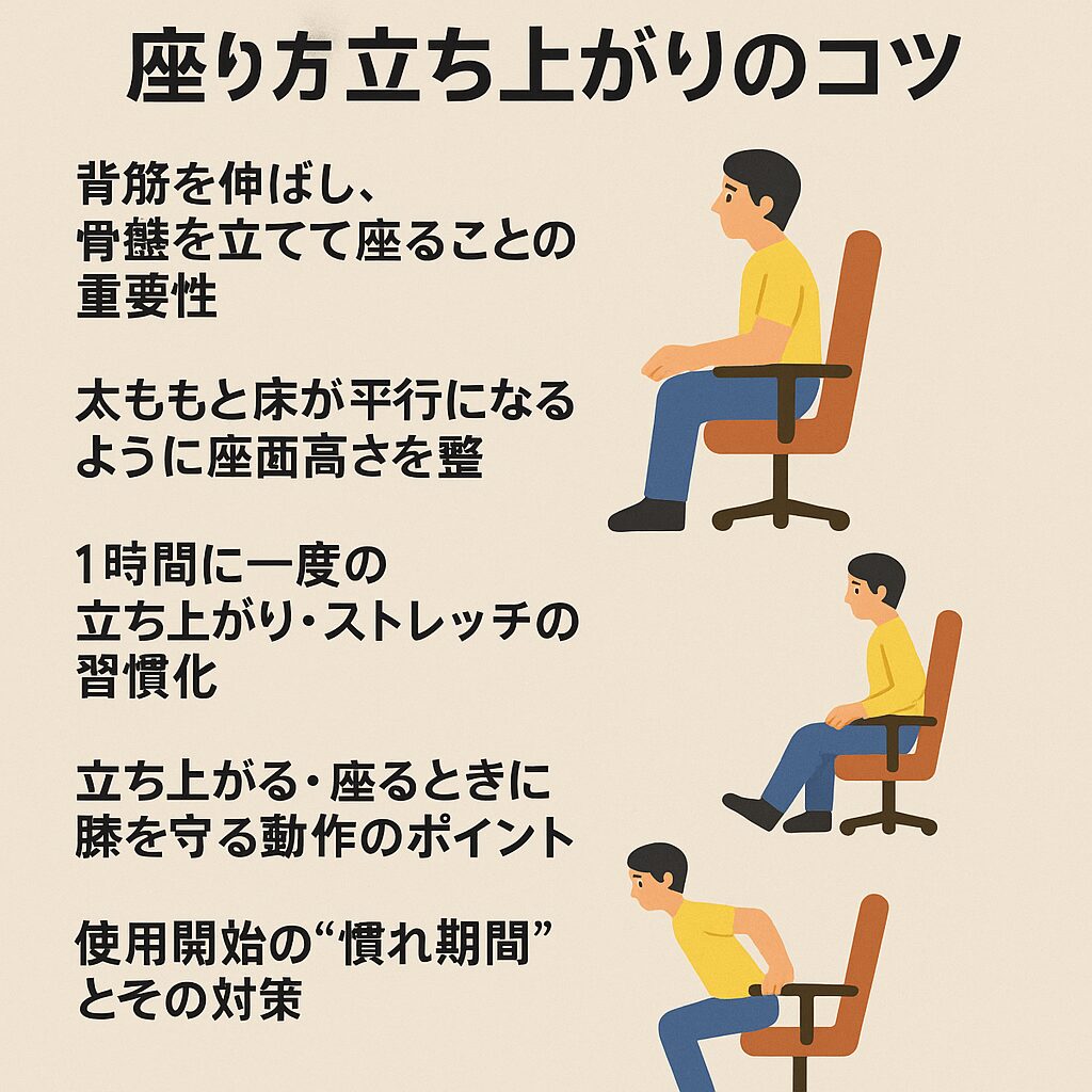 使い始めの段階でこの3つをチェックし、必要に応じて座布団や足置きで微調整することが推奨されています。