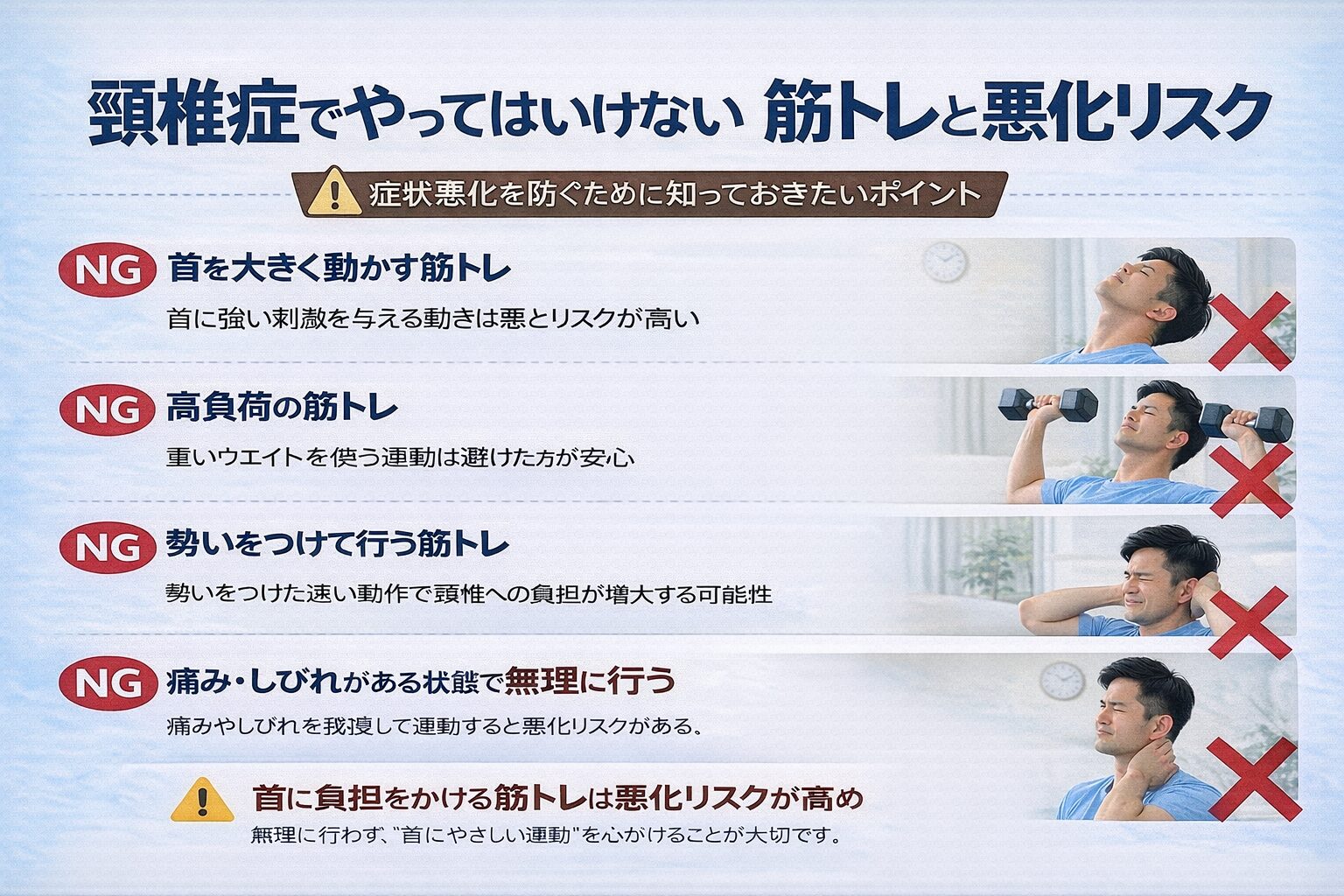 重たいウエイトを持ち上げる動作は、首や肩に強い力がかかりやすく、フォームが崩れると頚椎への負担が増す可能性があると言われています。