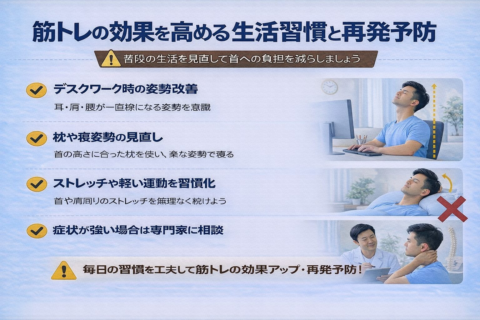 頚椎症のケアとして筋トレを取り入れる場合は、回数や強度よりも“正しいやり方”を意識することが大切だと言われています。無理な動きや過度な負荷は、首や肩に余計な負担をかける可能性があるため、慎重に進めることが推奨されています。