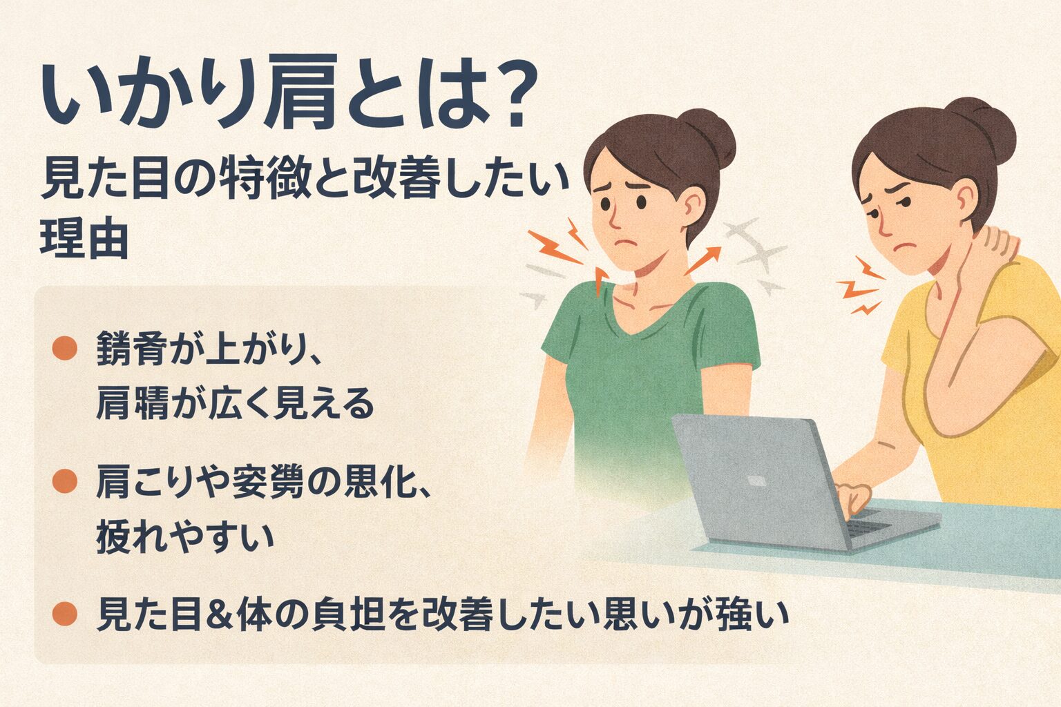 いかり肩は、日々の姿勢や体の使い方が積み重なって起こるケースが多いと言われています。まずは特徴を知ることが、改善への第一歩になると参考記事でも紹介されています。