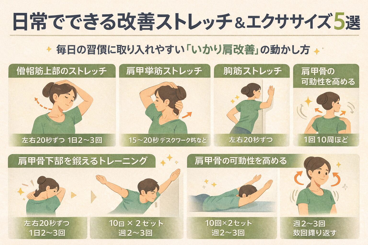 いかり肩改善は、ストレッチだけでなく、姿勢と筋肉バランスを理解したうえで整えていくことが大切だと、多くの専門記事で紹介されています。