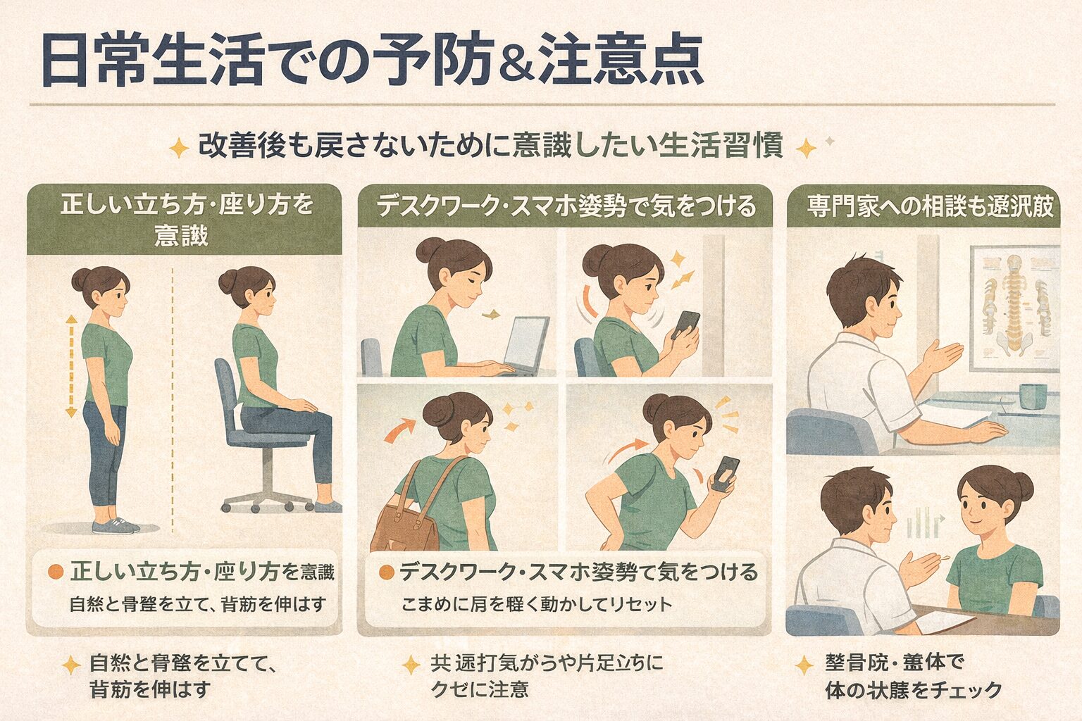 鏡でのチェック、日常姿勢の振り返り、症状の有無。この3つを確認することで、自分が改善を意識したほうがよい状態かどうかの目安になると参考記事でも紹介されています。