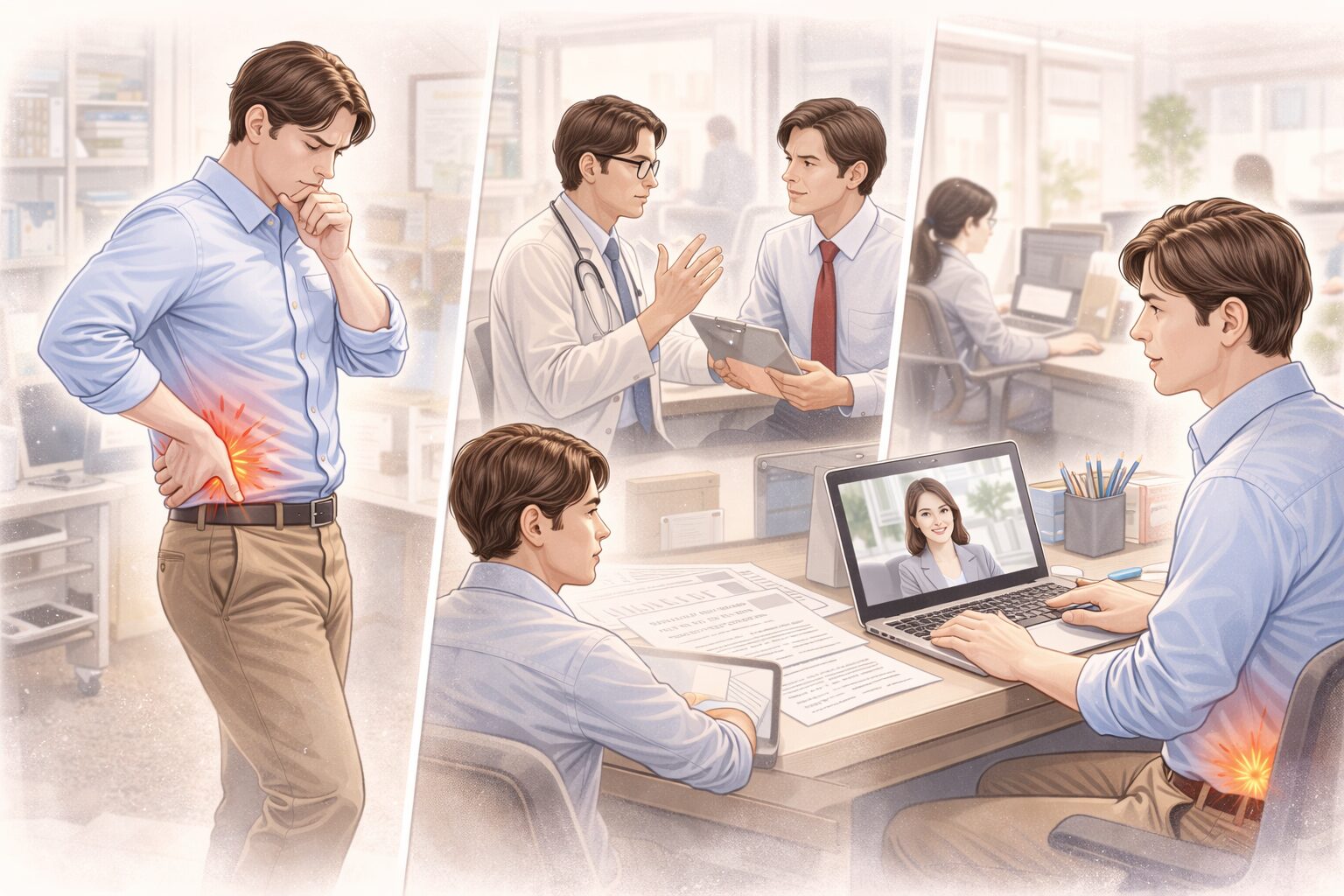 デスクワーク中心の仕事なら、様子を見ながら短期間で復帰する人もいるようですが、座りっぱなしも腰には負担になりやすいと言われています。休んでいる間は、無理に動かず、姿勢に気をつけて過ごすことが大切だとされています。
