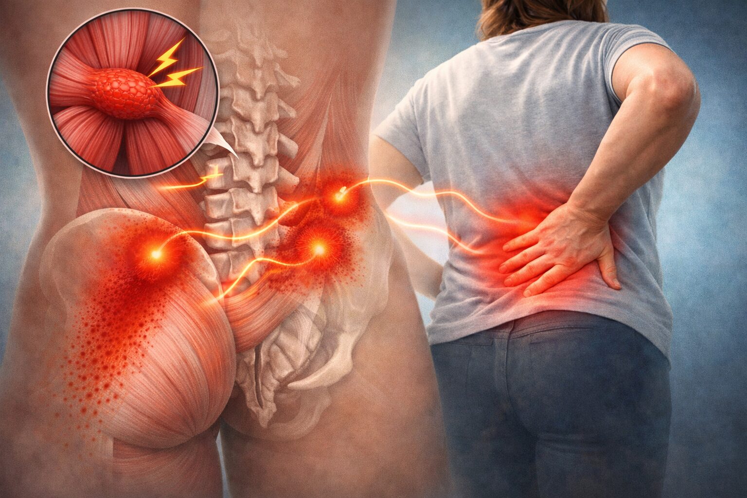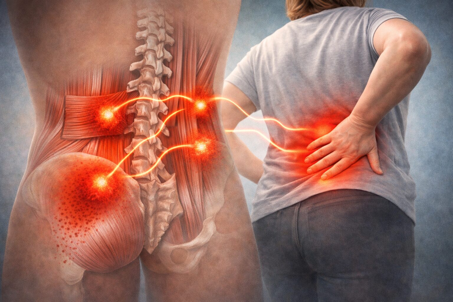たとえば、腰の筋肉にあるトリガーポイントが、お尻や太ももにまで痛みを広げるケースもあるとされています。そのため、「腰が痛い=腰そのものが原因」とは限らないのがポイントです。