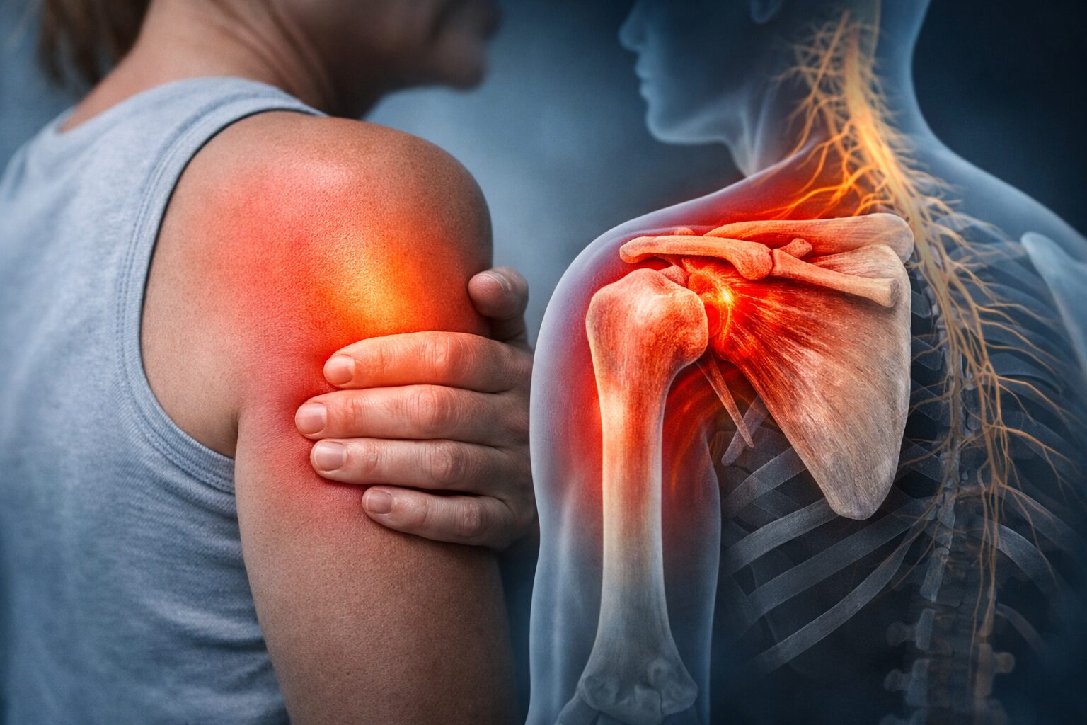 五十肩は「肩関節周囲炎」と呼ばれるように、肩の関節まわりに炎症が起こる状態だと言われています。この炎症は、関節だけでなく、その周囲にある筋肉や腱、さらに近くを通る神経のあたりにも影響することがあるそうです。その結果、痛みの感覚が肩だけでなく、二の腕のほうまで広がって感じられるケースもあると考えられています。