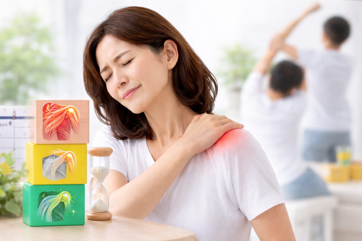 ざっくりした目安としては、炎症期は“とにかく痛い”、拘縮期は“動かない”、回復期は“少しずつ戻る”という流れがあると言われています。