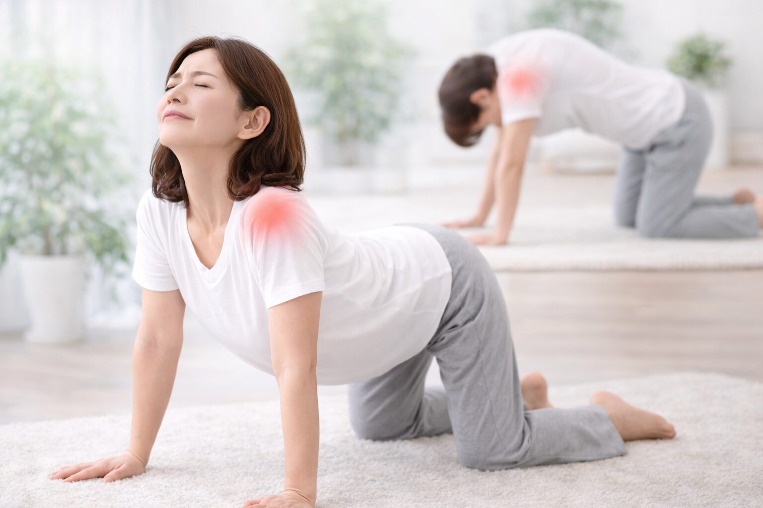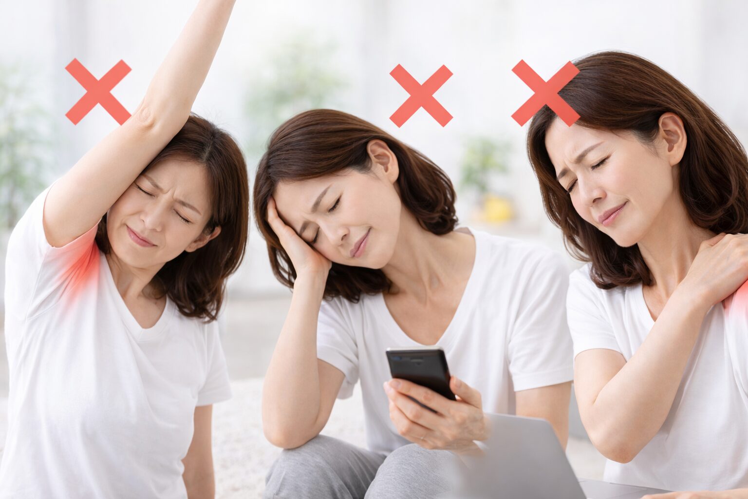 例えば、洗濯物を干そうとしたときや、髪を結ぼうとしたときに「あれ、上がらない…」と感じることがあります。また、じっとしているときは平気でも、動かした瞬間にズキッと痛むケースも少なくありません。