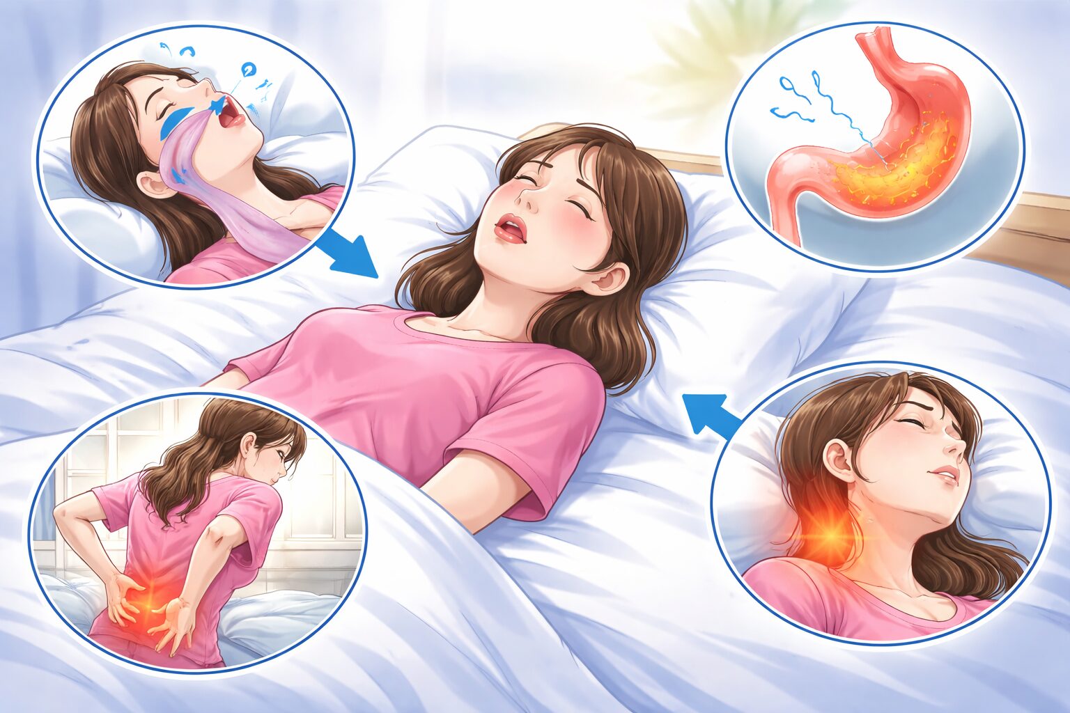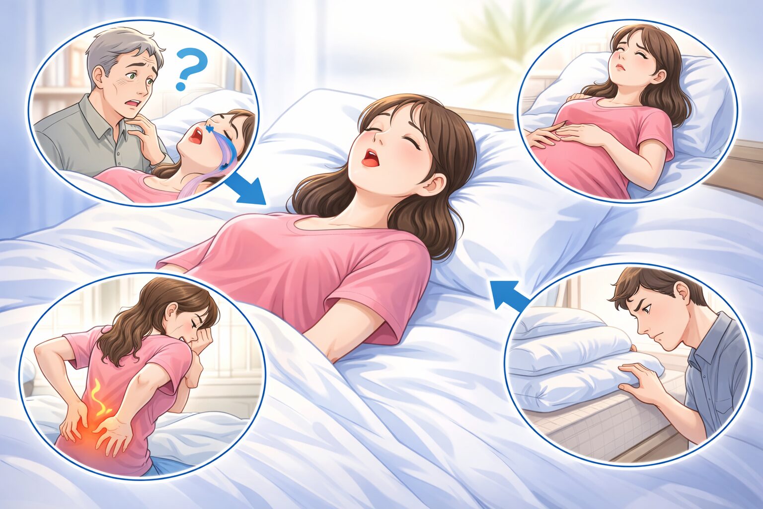 「関係する場合がある」と言われています。たとえば呼吸が乱れると、無意識に目が覚める回数が増えることがあります。本人は寝ているつもりでも、睡眠が細切れになると翌朝のスッキリ感が落ちやすいんですよね。「朝からだるい」「昼にぼーっとする」が続くなら、寝姿勢だけでなく寝具や生活リズムも一緒に点検したいところです。