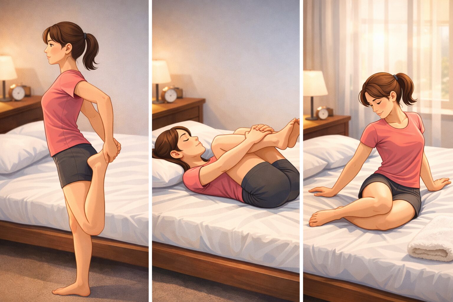寝る前は、立ったまま太もも前を軽く伸ばしたり、仰向けで膝を抱えるような動きがおすすめされることが多いです。