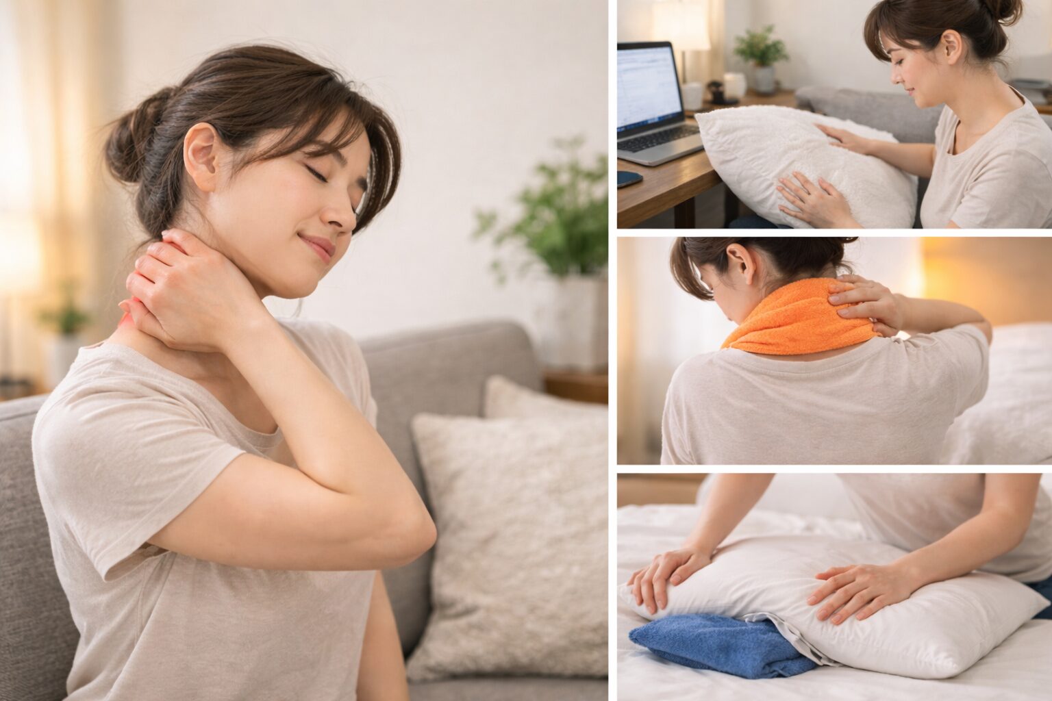 急に痛みが出た直後や、ズキズキする感じが強い場合は、冷やすことで炎症が落ち着きやすいと言われています。一方、慢性的な首筋のこりには、蒸しタオルなどで温めるとリラックスしやすいようです。