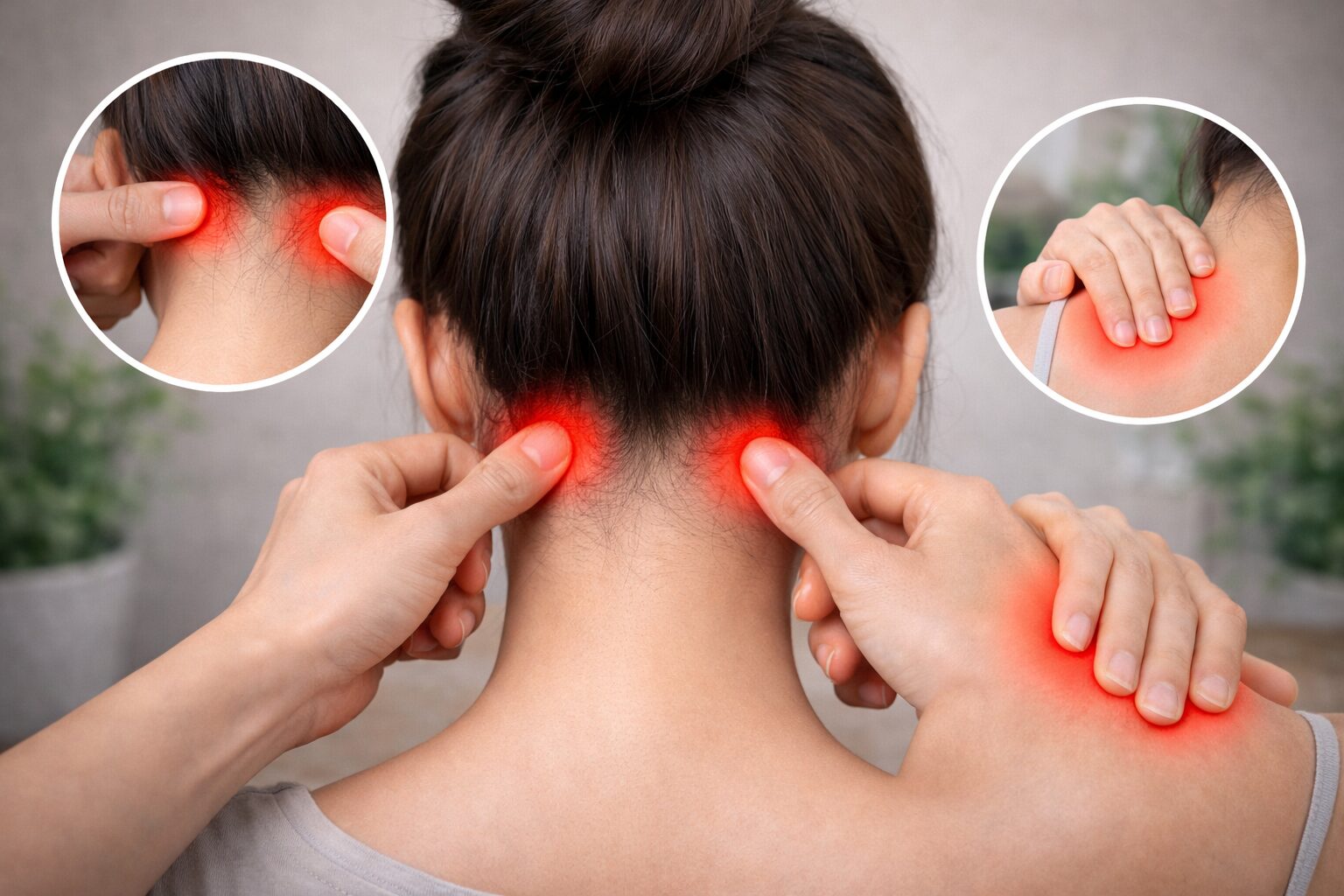 「どこ触ればいい?」って思ったら、まず首の後ろを両手で包むように触ってみてください。中央に太い筋(僧帽筋)があって、その少し外側に指が止まるポイントがあります。