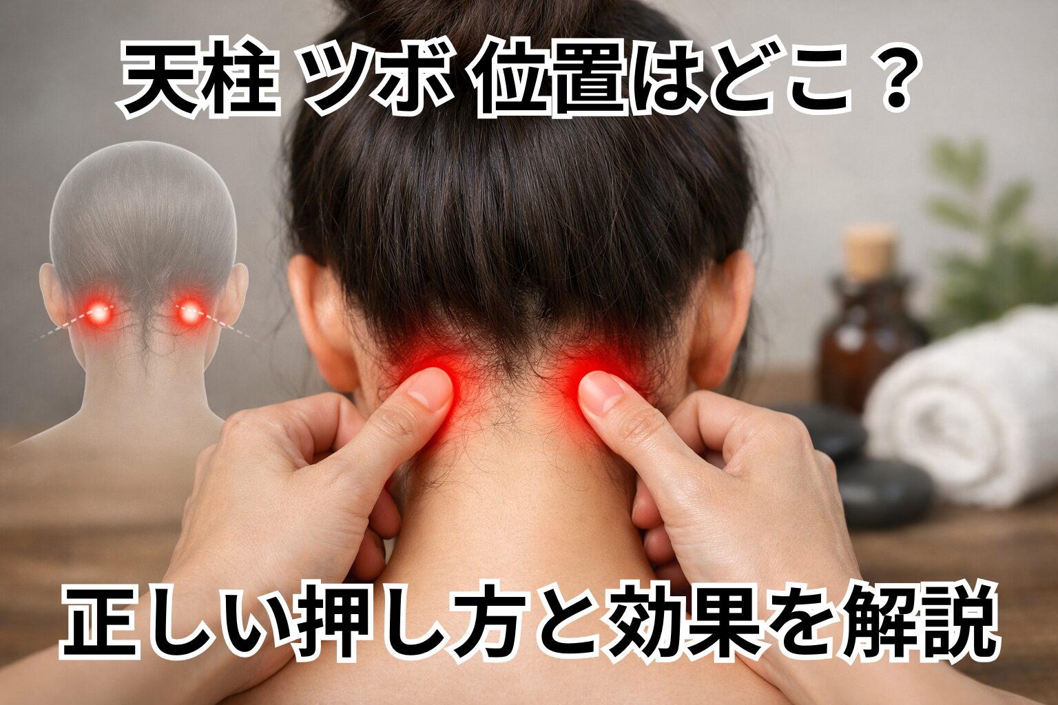 イメージとしては、首の付け根の左右にある少しくぼんだ部分。このあたりを触ってみると、筋肉が少し盛り上がっていて、その外側に指がスッと入るポイントがあるはずです。そこが天柱と言われています。