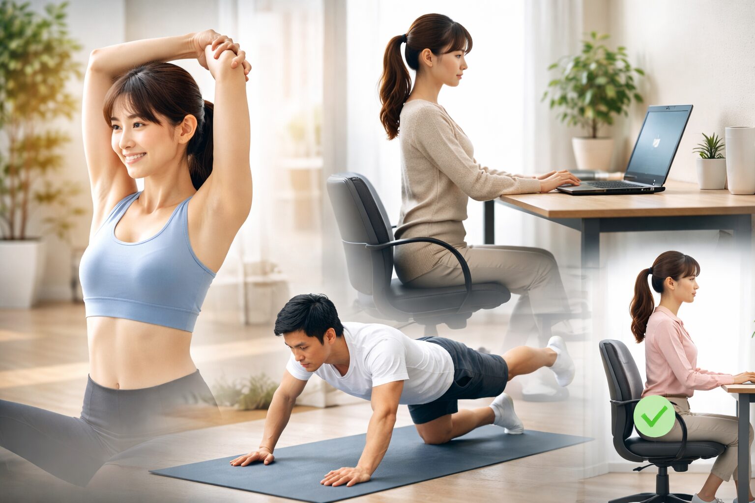 こう思ってしまいがちですが、実際は短時間でも生活に組み込むことが大切だと言われています。たとえば、朝起きたあとに軽いストレッチを1〜2分、仕事の合間に座り姿勢を整えるだけでも、姿勢への意識は変わりやすいそうです。