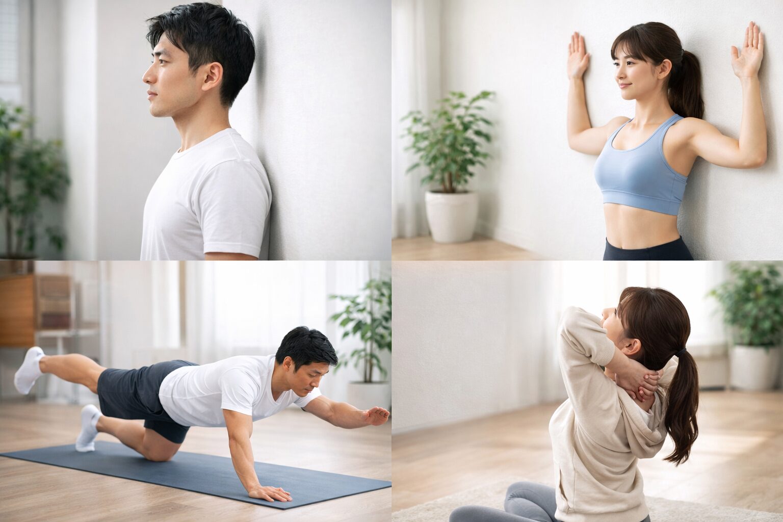 そう思う人も多いですが、実際は特別な器具がなくても取り組める方法が多いと言われています。ここでは、自宅で実践しやすく、姿勢改善に役立つとされている代表的なトレーニングを紹介します。