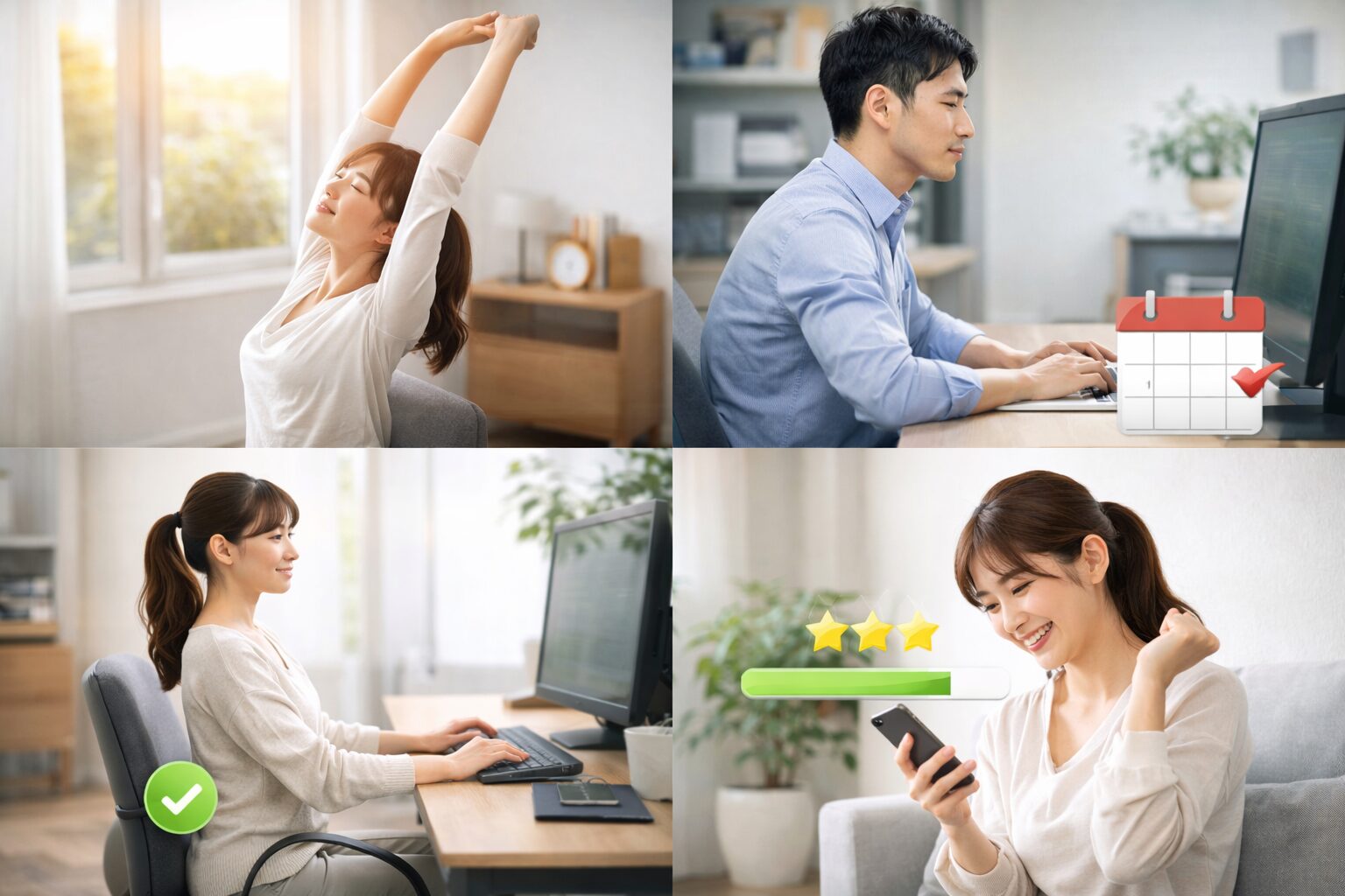 また、「姿勢を正そう」と力を入れすぎるより、**「今ちょっと丸まってるかも?」**と気づくだけでも十分だと言われています。小さな気づきを積み重ねることで、結果的に継続しやすくなるケースも多いようです。