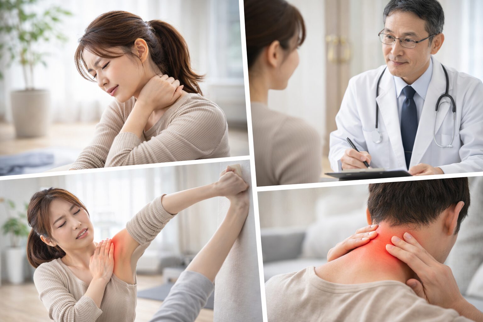 巻き肩由来の不調は、姿勢を整えたり、ほぐしたりすると軽く感じることがあると言われています。一方で五十肩のように、腕を上げる角度で鋭く痛む、ある動きが明確にできない、といった特徴が出る場合もあるようです。また頸椎(首)由来だと、首を動かしたときにしびれが増える、腕まで放散する感覚がある、などの訴えが見られることがあると言われています。自己判断がむずかしい領域なので、「いつもと違う」が続くなら、早めの相談が無難だと考えられています。