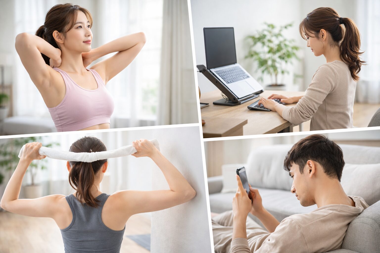 「スマホ見てたら、いつの間にか前のめり…」これが積み重なると、巻き肩が定着しやすいと言われています。長時間の前傾、片手スマホ、ソファで丸まる姿勢は要注意だとされることが多いです。完璧にやめるのが難しければ、30〜60分に一度だけ胸を開いて深呼吸、肩を後ろに回す。そんな“こまめなリセット”が現実的だと言われています。
