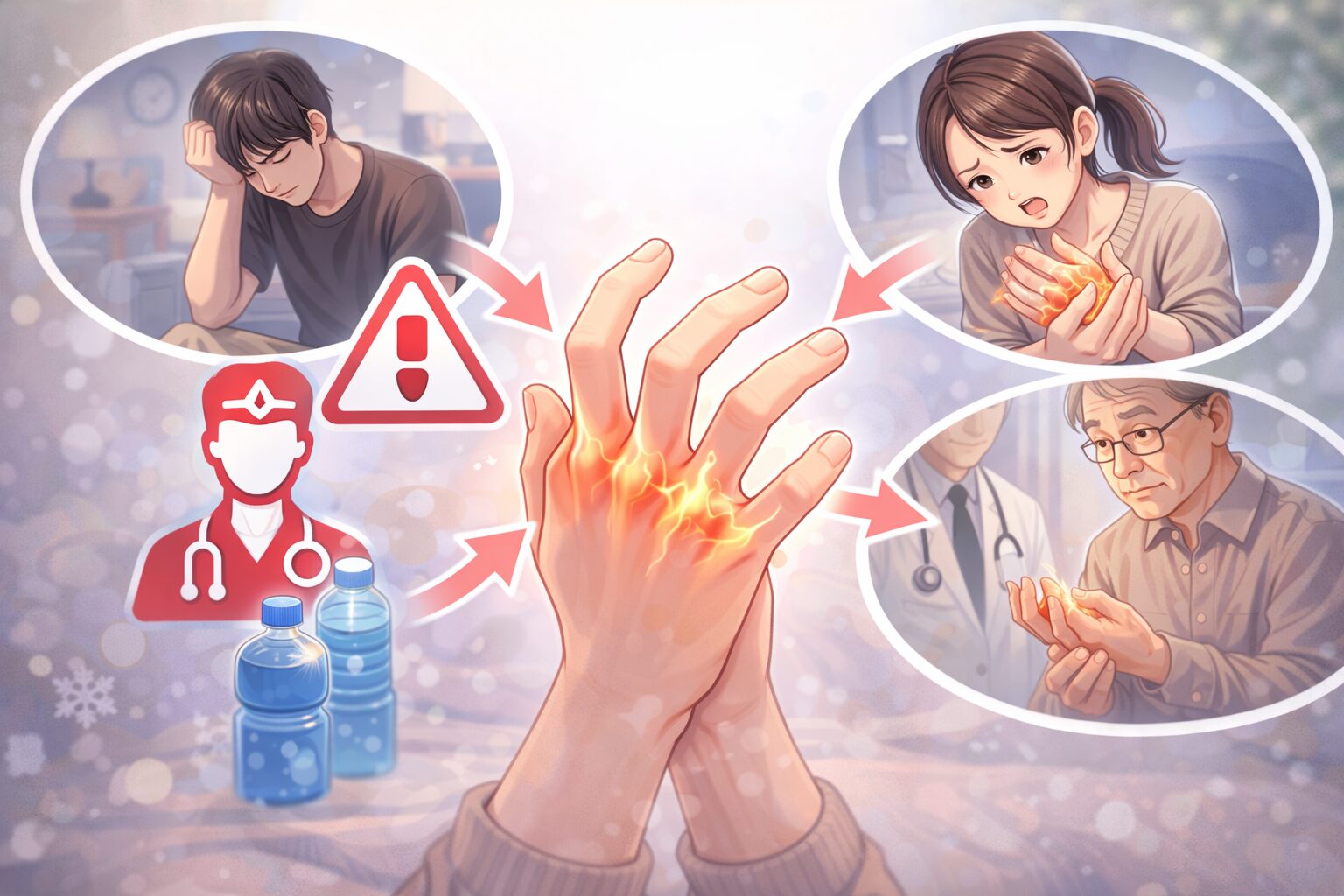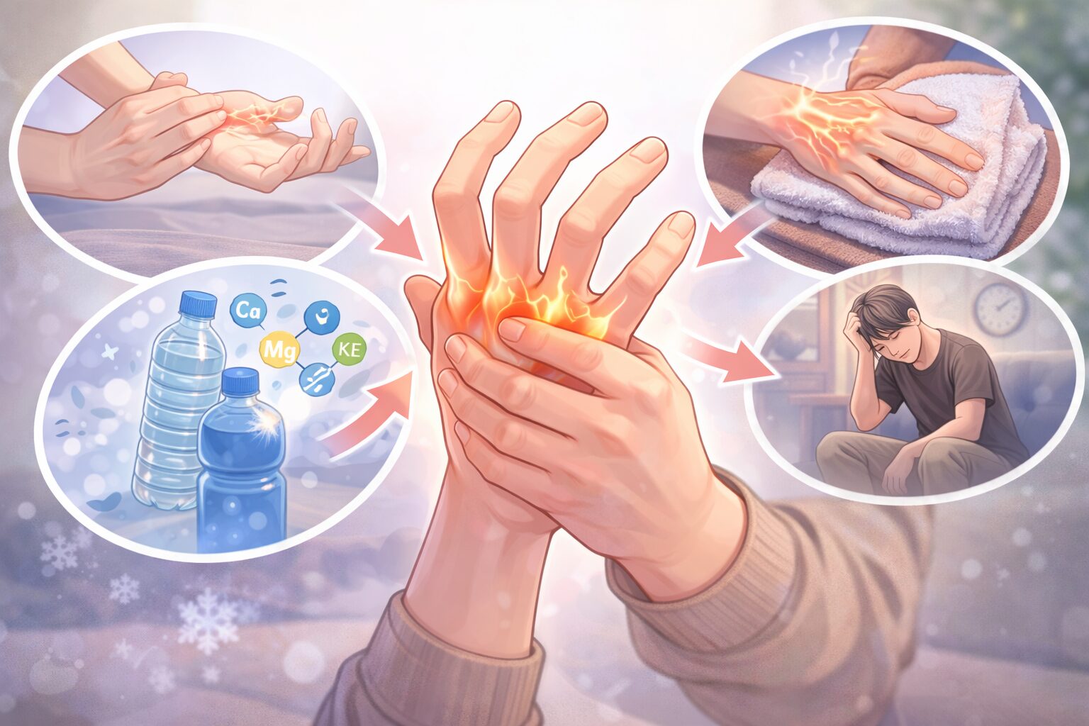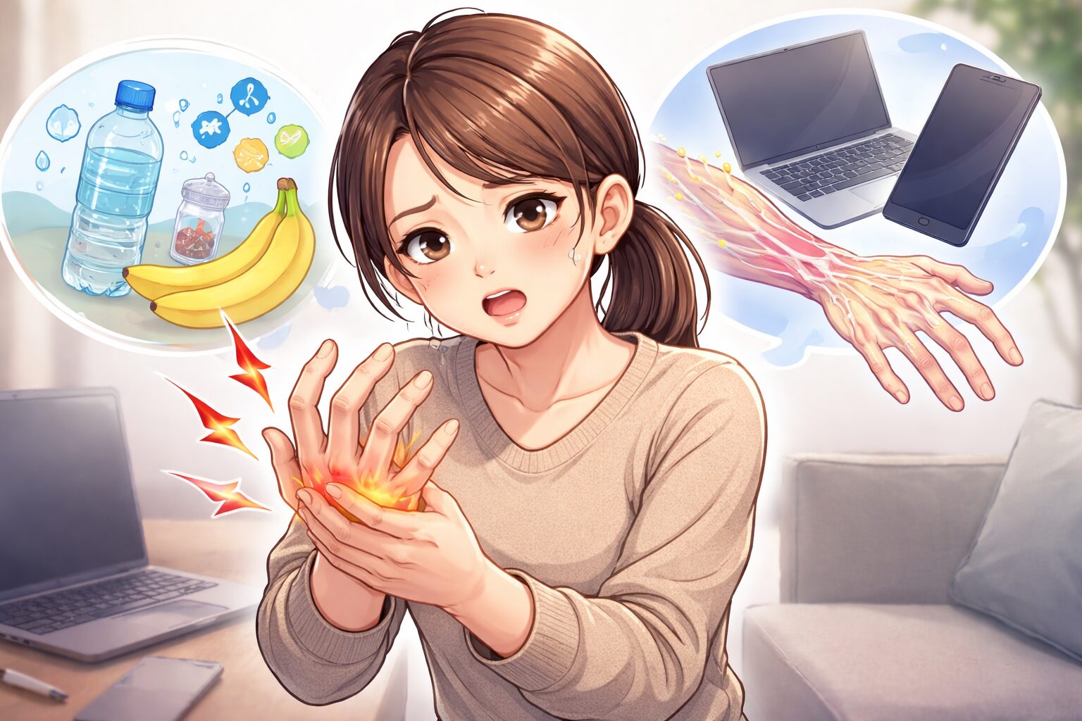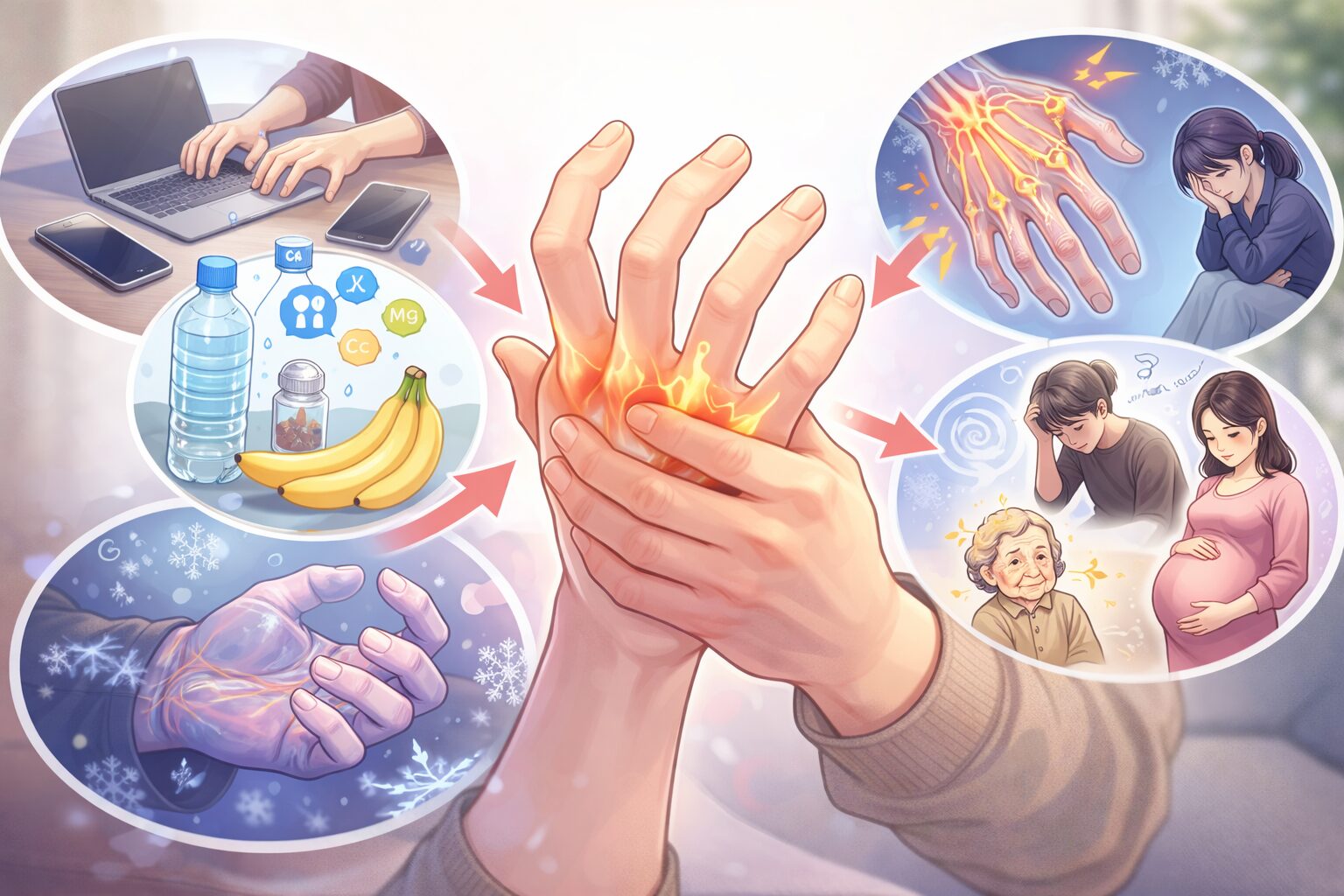 「そもそも、どうして手がつるの?」と気になりますよね。実は、原因はひとつではなく、いくつかの要素が重なって起こることが多いと言われています。ここでは、よく知られている代表的な原因を順番に見ていきましょう。