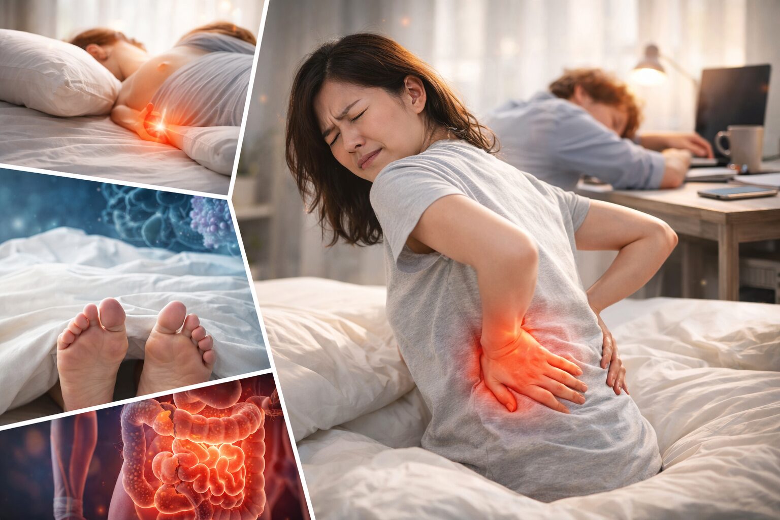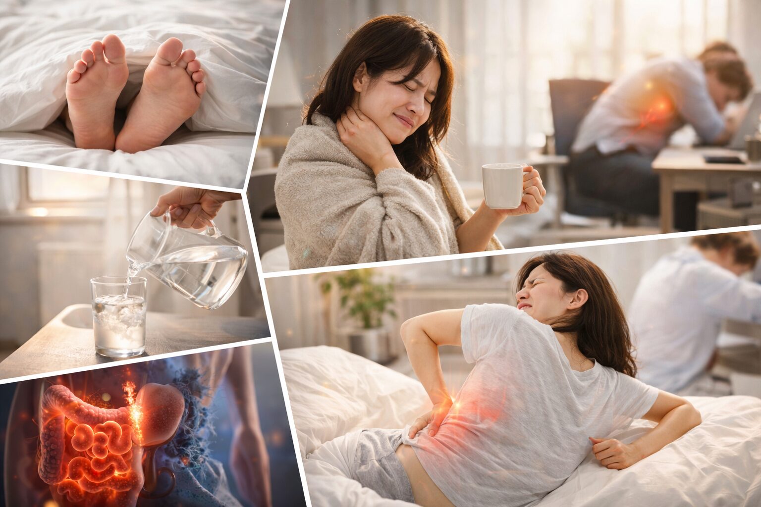 「寝ただけなのに痛いって、どういうこと…?」って不安になりますよね。ざっくり言うと、寝ている間は“動かない+冷える+圧がかかる”がセットになりやすく、筋肉や周りの組織が固まりやすいと言われています。そこに、合わない枕やマットレス、寝返り不足が重なると、朝いきなり動いた瞬間に痛みとして出やすいようです。だから起きる前に布団の中で足首を回す、軽く伸ばすなど、まず“目覚まし運動”から入るのがよいと言われています。