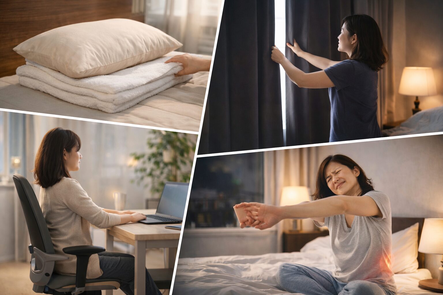 日中の猫背・反り腰・片足重心が続くと、筋肉の緊張がたまりやすく、朝に“まとめて痛む”感覚が出るとも言われています。対策はシンプルで、1時間に1回立つ、肩甲骨を寄せて深呼吸、帰宅後に股関節を軽く回す…このくらいでOK。さらに就寝前にやさしいストレッチを入れると、寝返りもしやすいと言われています。無理に頑張らず「続けられる強さ」にするのがコツです。