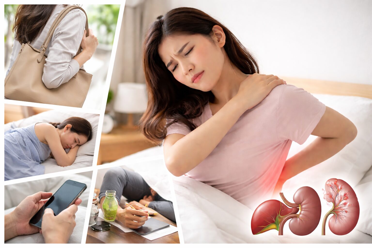 私: 右側の背中の痛みは、肝臓・胆のう・腎臓などの不調が関連することもあると言われています。発熱、吐き気、黄疸(皮ふや白目が黄色い)、尿の違和感などが一緒に出るなら要注意。こういうときは早めに医療機関へ来院するのが望ましい、とされています。