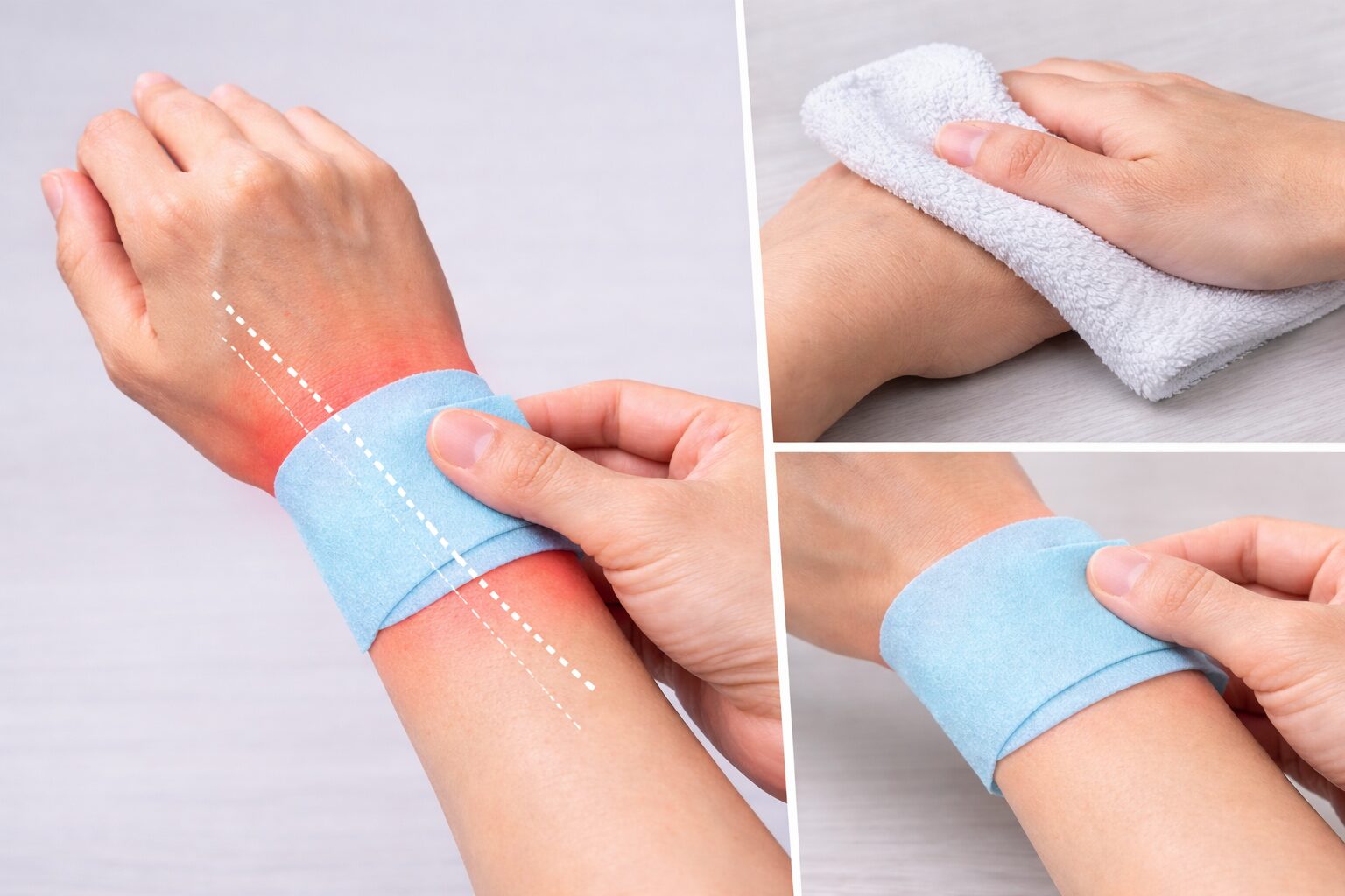 意外と見落としがちなのが「湿布を引っぱって貼る」癖。ピンッと伸ばして貼ると、手首を曲げた瞬間に戻ろうとして端が浮きやすいと言われています。コツは、手首を軽く曲げた状態で、湿布を伸ばさず置くこと。貼ったあとに数回ゆっくり動かして、浮きやすい場所だけ押さえると安定しやすいです。