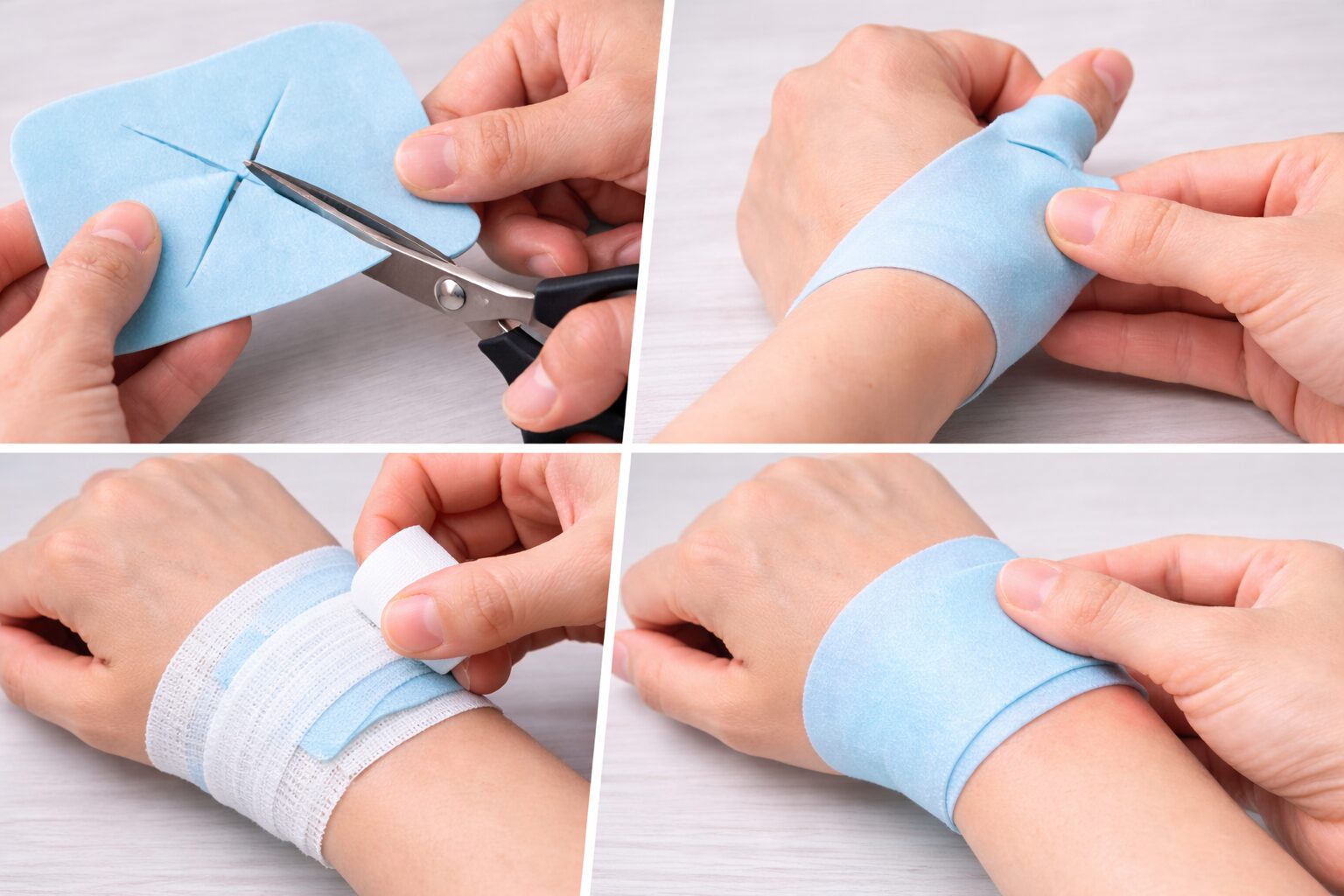 「湿布 手首 貼り方で一番困るの、結局“剥がれる”なんですよね。」そんなときに定番なのがX字カット。湿布の中心に小さく切れ込みを入れて、手首の動きに合わせて“逃げ”を作るイメージです。「関節をまたぐと端が浮く」と言われているので、切れ込みでフィットしやすくすると剥がれにくい傾向があります。切りすぎると強度が落ちやすいので、まずは浅めから試すのが安心です。