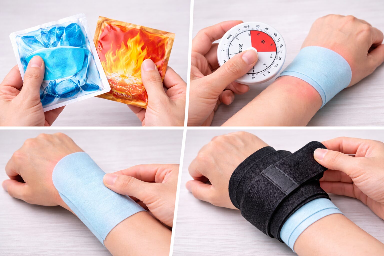 「湿布だけだと動かすと痛い…」なら、サポーターの併用を考える人もいます。一般的には、作業中だけ軽く支える目的で使うと負担が減りやすいと言われています。ただ、締めすぎるとしびれや違和感につながることもあるので、指先の色や感覚を確認しながらが安心です。痛みが強い、腫れが引かない、動かしづらさが続く場合は来院を検討するとよいと言われています。