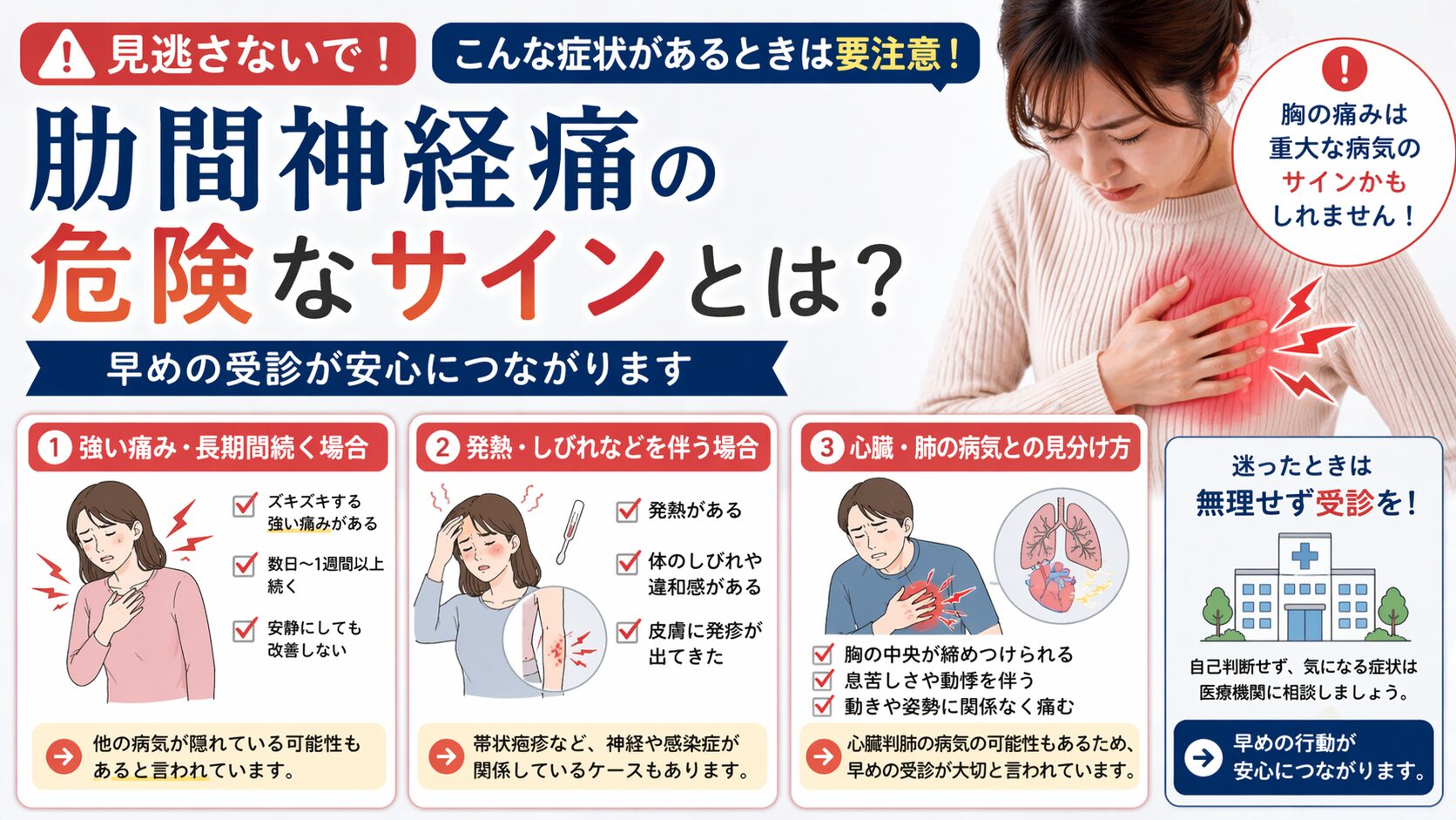 胸まわりの痛みは、不安になりますよね。結論からいうと、肋間神経痛の可能性があっても、いくつかのサインがある場合は早めの来院が大切と言われています。ここでは注意したいポイントを整理していきます。