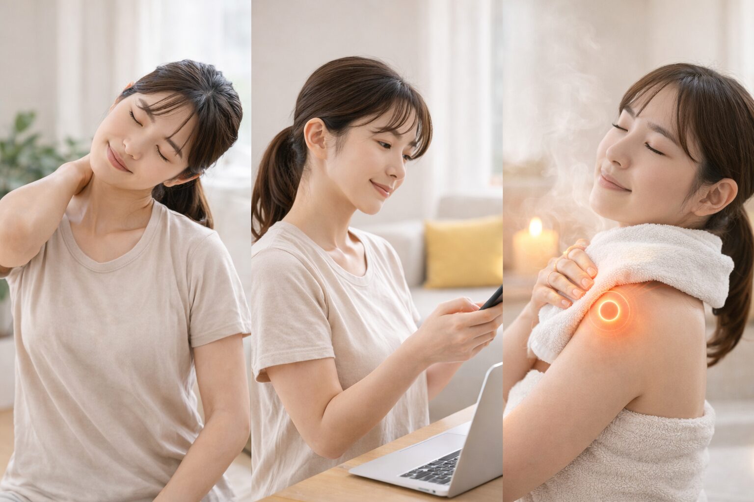 おすすめは、入浴や蒸しタオルで首や肩を温めること。特別なことをしなくても、日常の中で十分取り入れられます。