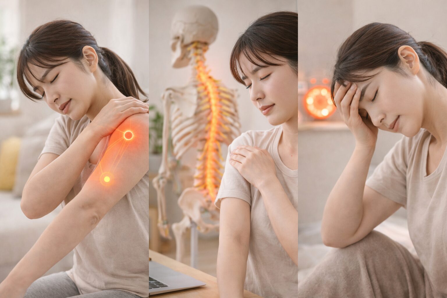 肩から腕にかけてのしびれは、筋肉だけでなく神経や血流の影響を受けていると言われています。長時間のデスクワークやスマホ操作で姿勢が崩れると、首や肩まわりが固まり、神経が圧迫されやすくなるんですね。