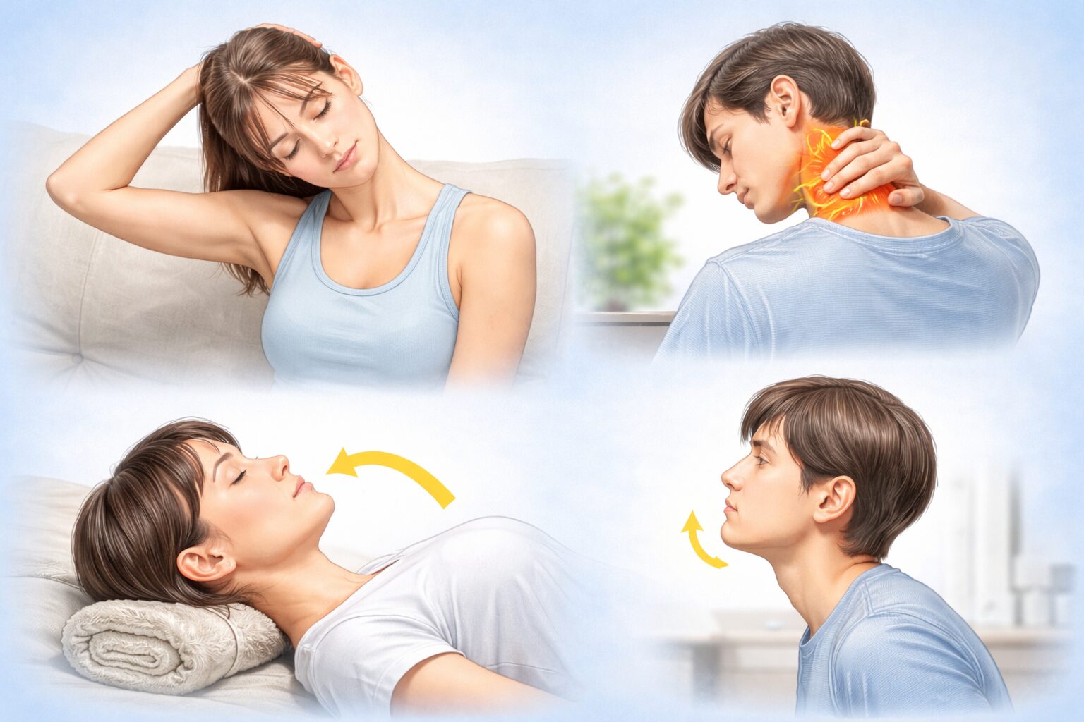 この場合、後頭下筋群を意識したケアが役立つこともあるそうです。仰向けでタオルを首の下に入れ、軽くうなずくような動きがケアにつながると言われています。