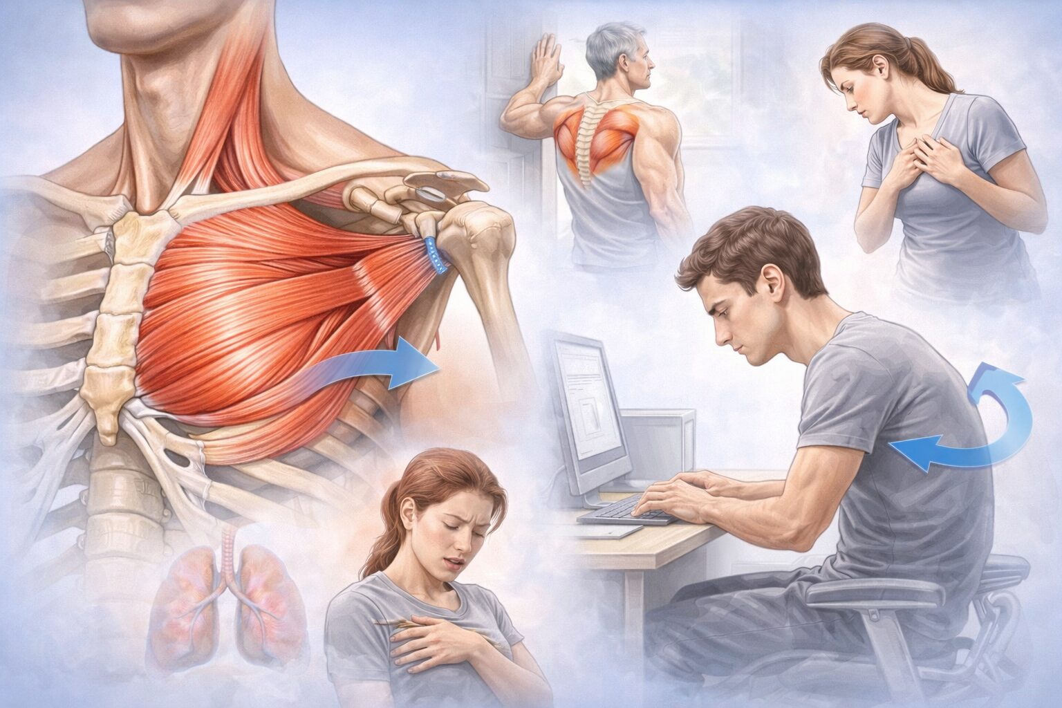 また、小胸筋は肋骨に付着しているため、呼吸を補助する筋肉の一つとして紹介されることもあります。呼吸が浅く感じやすい人は、姿勢との関係も含めて注目されるケースがあるようです。