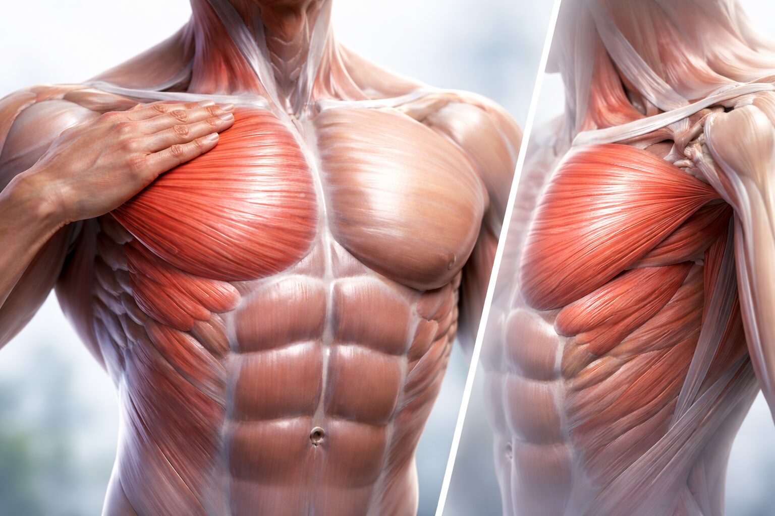 胸の前面=大胸筋、奥=小胸筋、さらに肩甲骨の動きも関係…と全体で捉えると、体の感覚と説明がつながりやすいです。