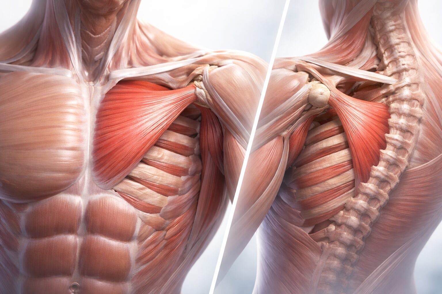 「肋骨から肩の前に引っ張る筋肉」と考えると、ぐっとわかりやすくなります。大胸筋みたいに表面で触って確認しづらいので、まずは“向き”を覚えるのが近道でしょう。