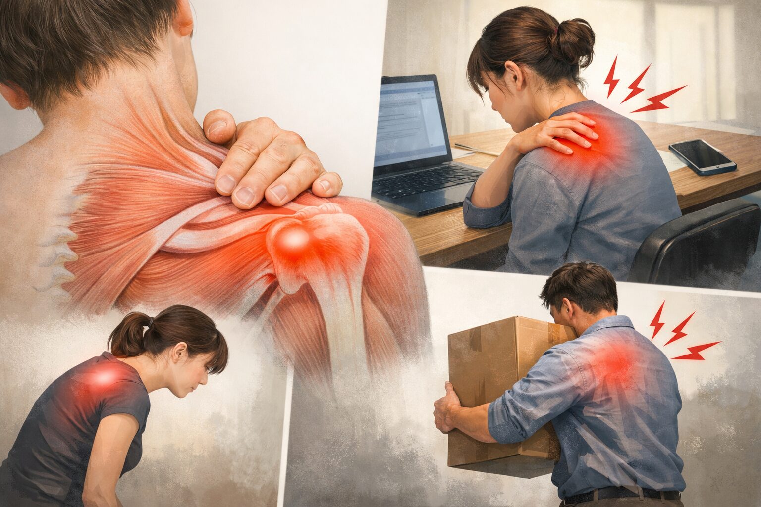 長時間のデスクワーク、スマホ操作、同じ側でバッグを持つ習慣などが、腕と肩の付け根の痛みにつながることもあると言われています。