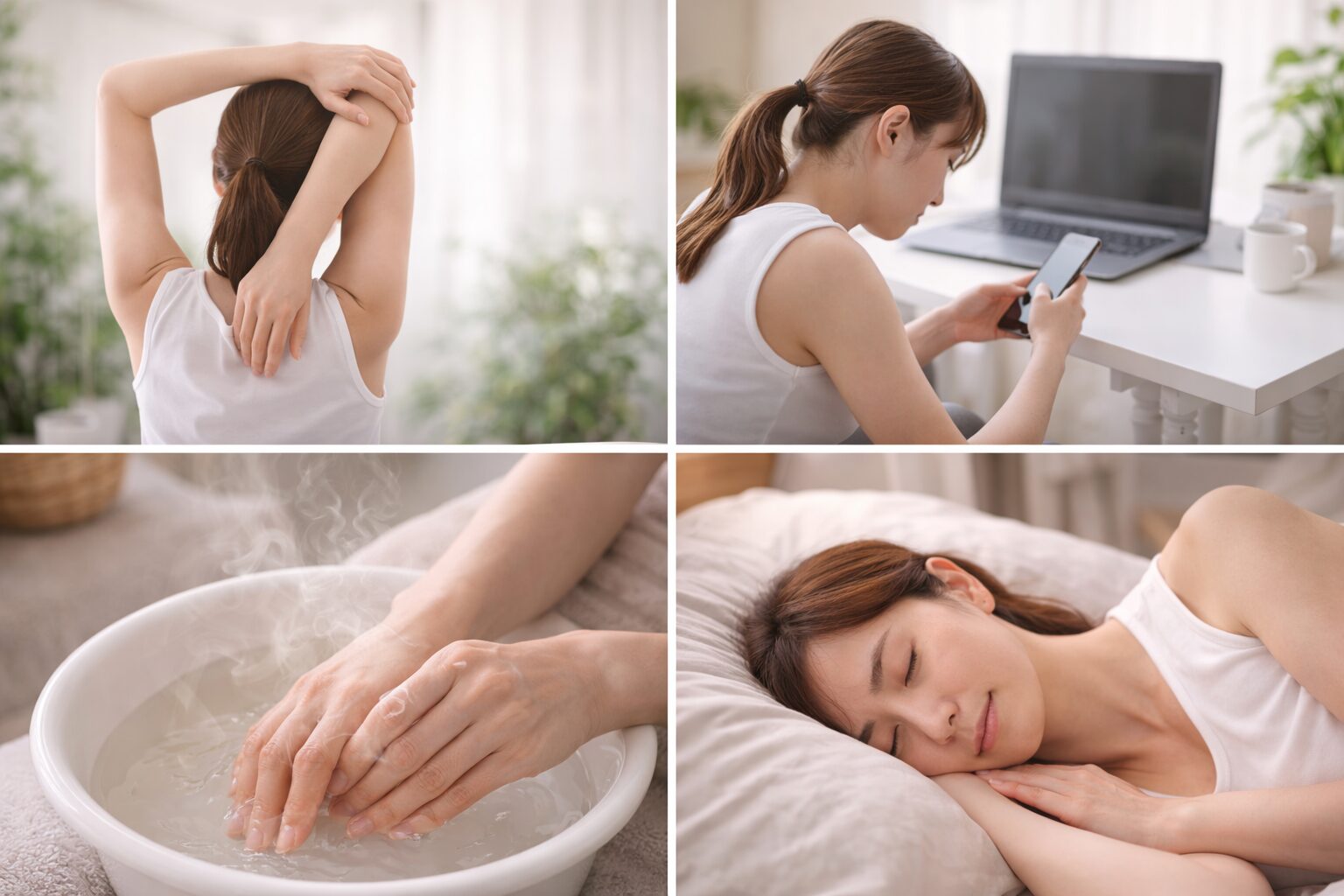 実は、腕のしびれ対策はツボだけでなく、日常の習慣も大きく関係していると言われています。ここでは、自宅で取り入れやすいセルフケアを紹介していきます。