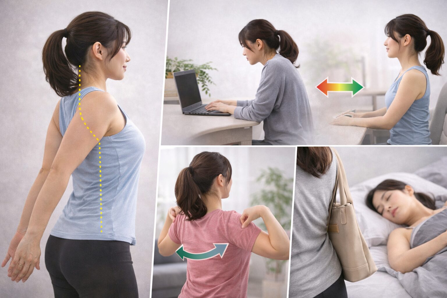 片側ばかりの負担や、横向きで丸まった睡眠姿勢も影響することがあるそうです。左右を意識して持ち替える、仰向けで肩が沈みすぎない寝姿勢を意識するなど、小さな工夫が大切だと言われています。