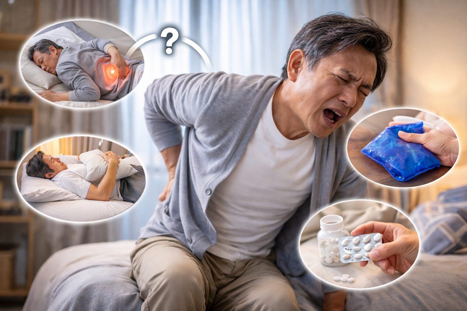 たとえば、横向きで膝を軽く曲げる姿勢や、仰向けで膝の下にクッションを入れる方法などが、負担を減らす姿勢として知られています。