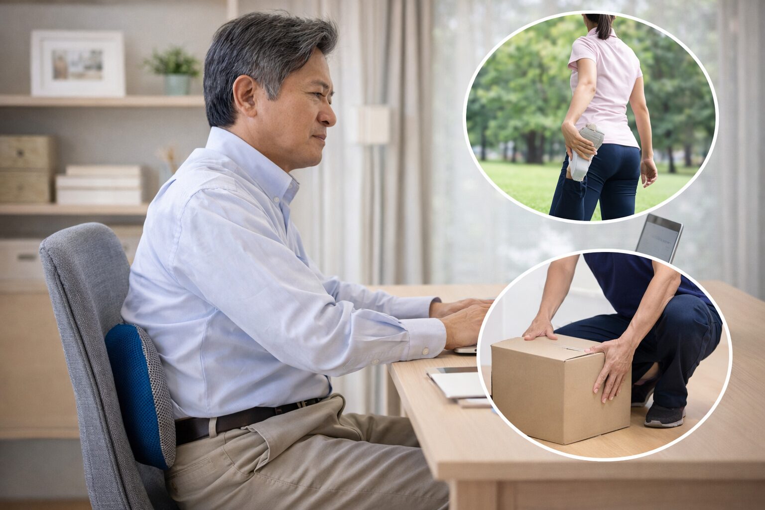 座るときは背筋を軽く伸ばし、立つときも左右のバランスを意識するだけでも負担が変わるとされています。