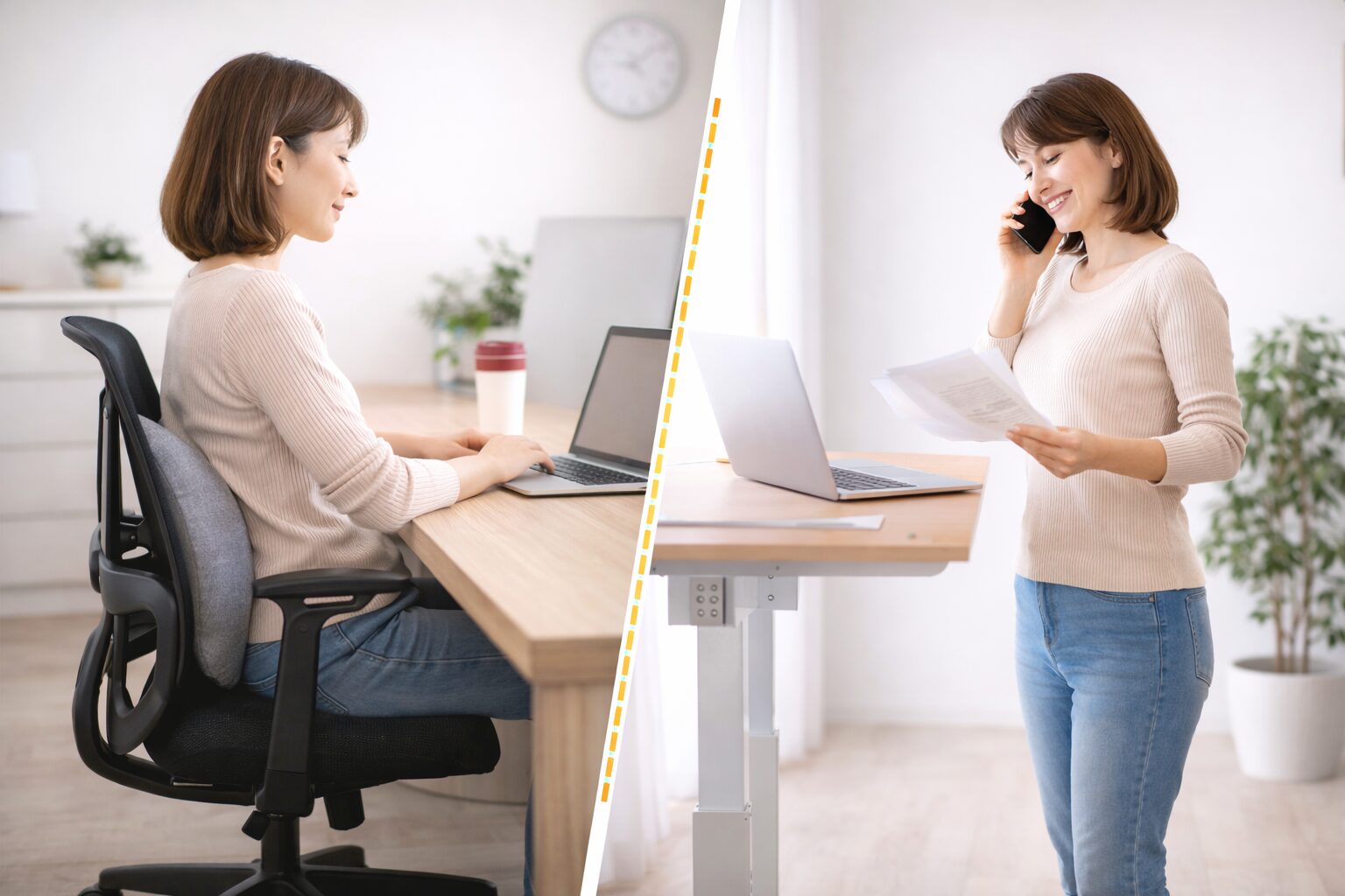 一般的には、立位と座位をバランスよく切り替えるほうが、腰への負担が分散されやすいと言われています。例えば、集中作業は座って、電話対応や資料確認は立って行う、というように姿勢をこまめに変えるイメージです。