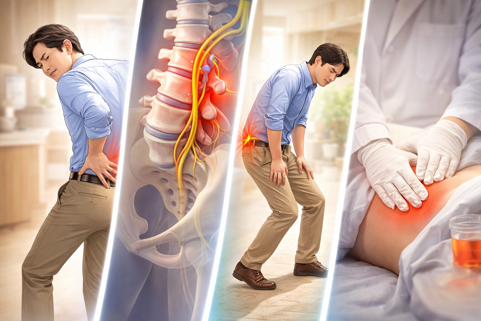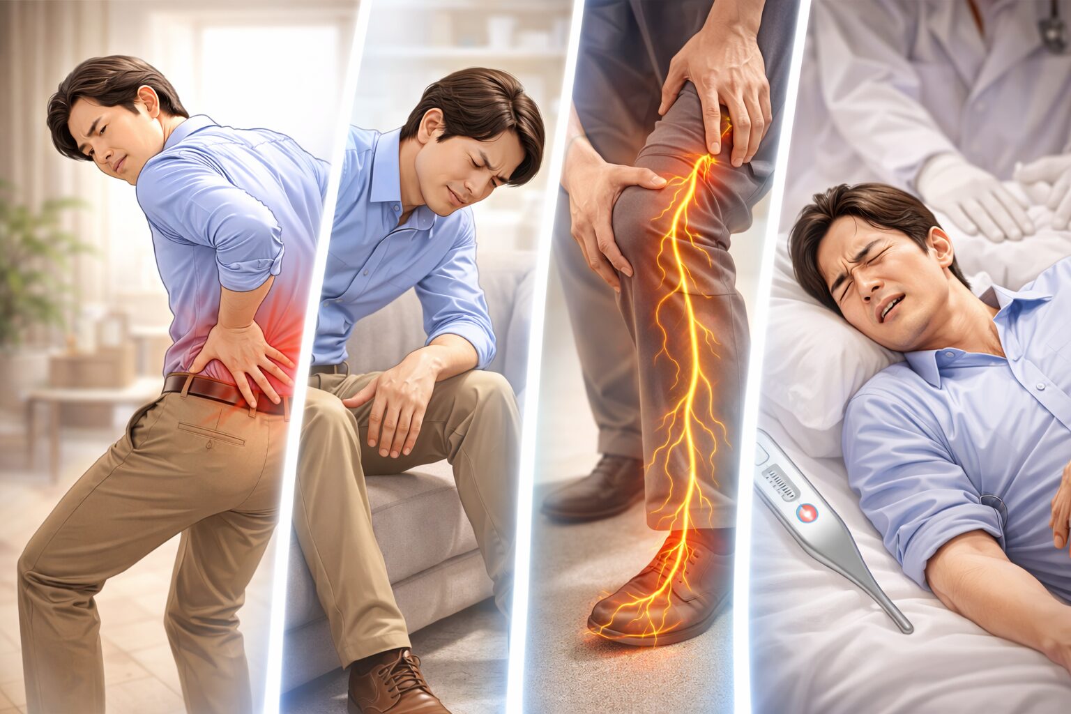 次に考えたいのが“神経が刺激されている”パターンと言われています。腰からお尻、太ももにかけて痛みやしびれが出る、咳やくしゃみで響く、長く立つほど脚まで重い… 이런感じがあるなら、神経の関与も疑われることがあるそうです。座る姿勢でラクになる人もいれば、逆に悪化する人もいるため、「座れるから大丈夫」と決めつけない方が安心です。