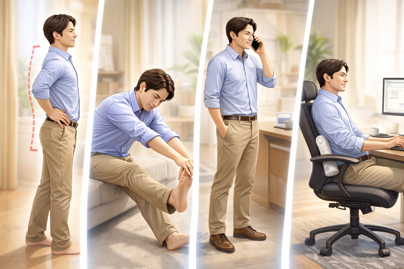 「腰痛 立つと痛い 座ると楽」って人は、まず“立ち方・座り方”を整えるだけでも体がラクになることがあると言われています。立つときは、反り腰にならないように肋骨をふわっと下げて、頭が上からつられる感じを意識すると安定しやすいです。座るときは、骨盤を立てるイメージで深く座り、背中を丸めすぎないのがコツ。とはいえ「ずっと良い姿勢で!」は現実的じゃないので、30〜60分に一度、軽く立ち上がるだけでも負担が分散しやすいそうです。