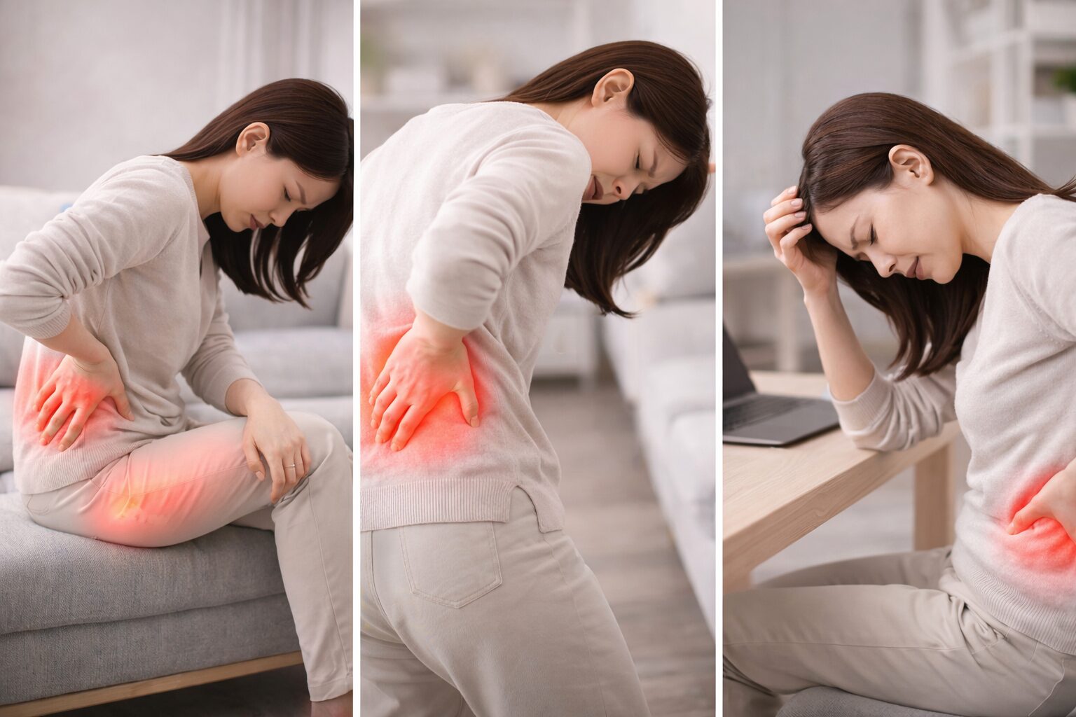 たとえば、長時間座れない、立ち上がるのがつらい、歩くのも違和感があるなど、日常動作に支障が出ている場合は注意が必要とされています。
