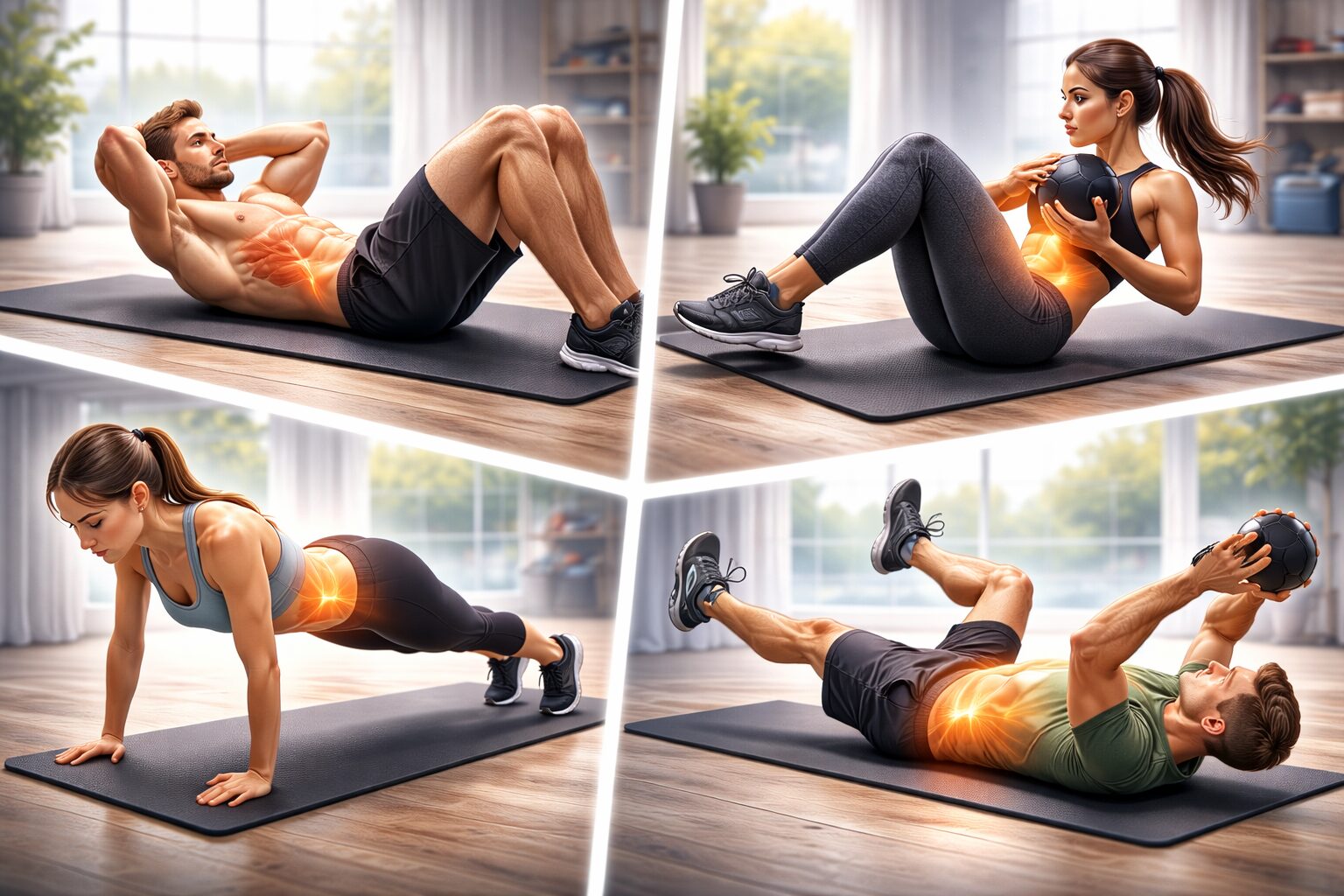 まず、いわゆるシックスパックとして知られる腹直筋には、クランチやシットアップが代表的だと言われています。上体を軽く丸める動作で、お腹の前側に刺激を入れやすいのが特徴とされています。