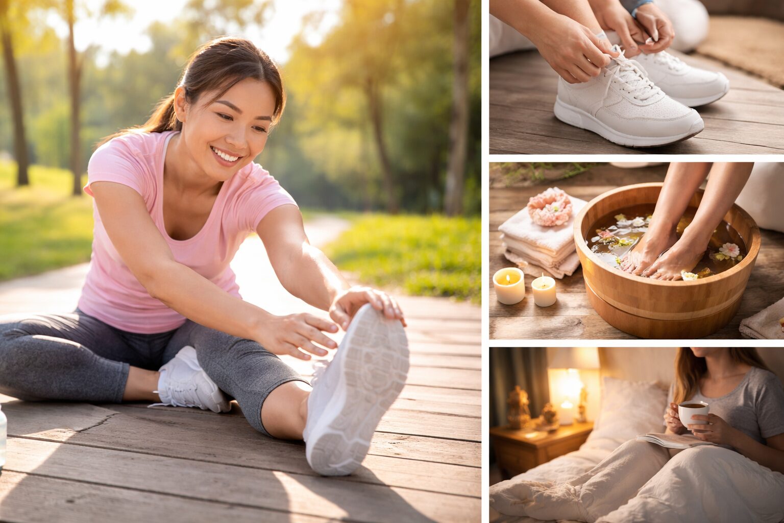 ストレッチや軽い運動、冷え対策、姿勢の見直しなど、基本的なケアを習慣化することで、足への負担を減らしやすくなると考えられています。