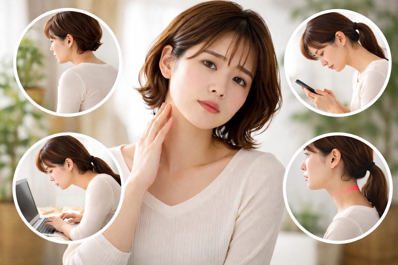 長時間のスマホ操作やデスクワークは、前かがみの姿勢になりやすく、首が前に出るクセがつきやすいと言われています。