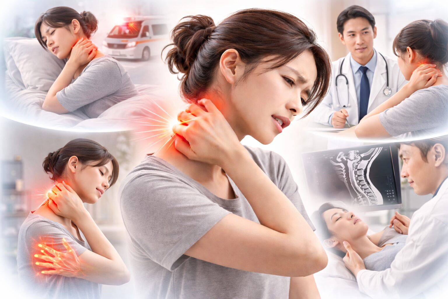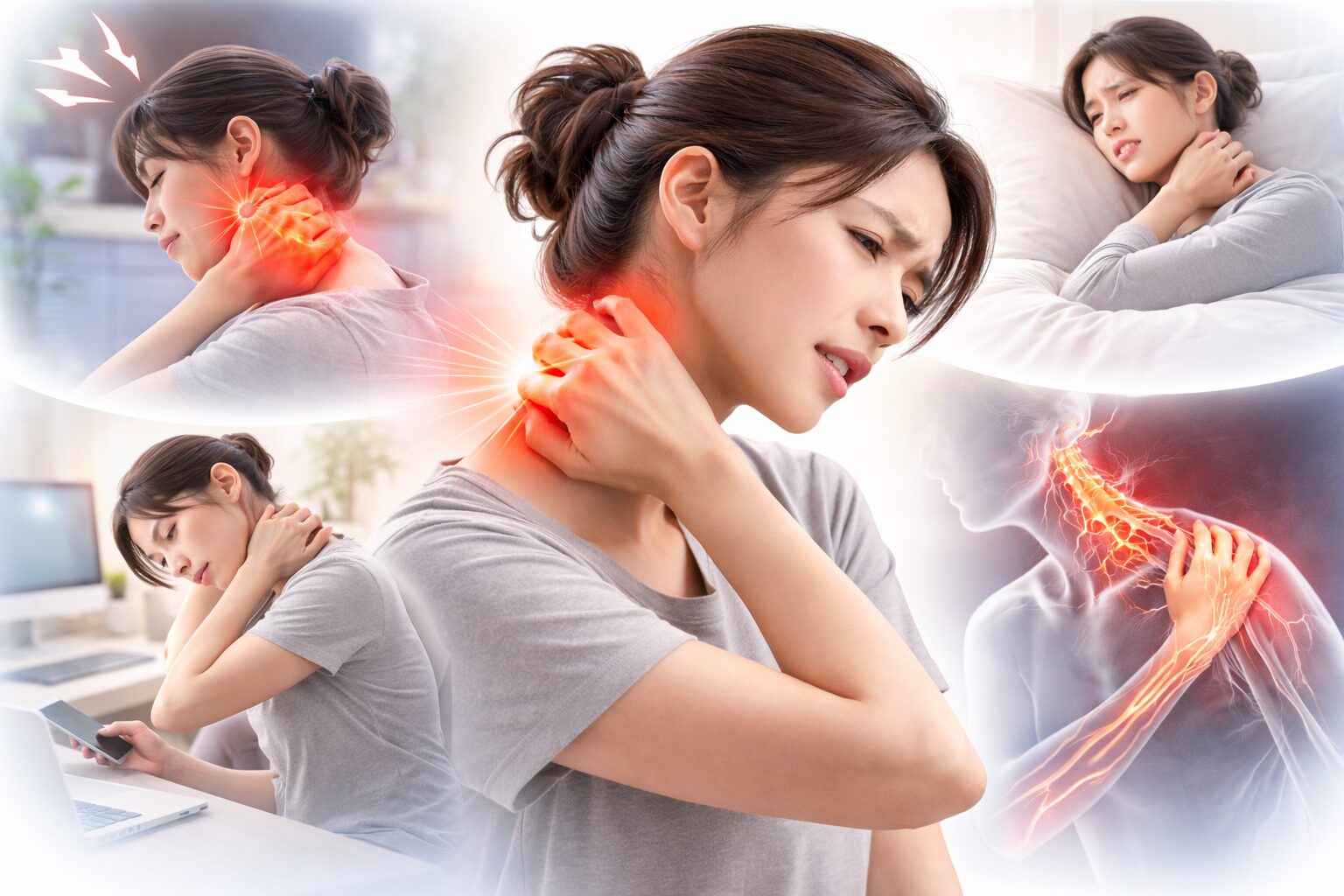 こうした症状がある場合、頸椎椎間板ヘルニアや頚椎症など、神経や椎間板が関係している可能性も考えられると言われています。痛みの出方が筋肉由来と違う点が特徴とされています。